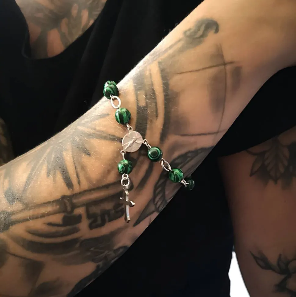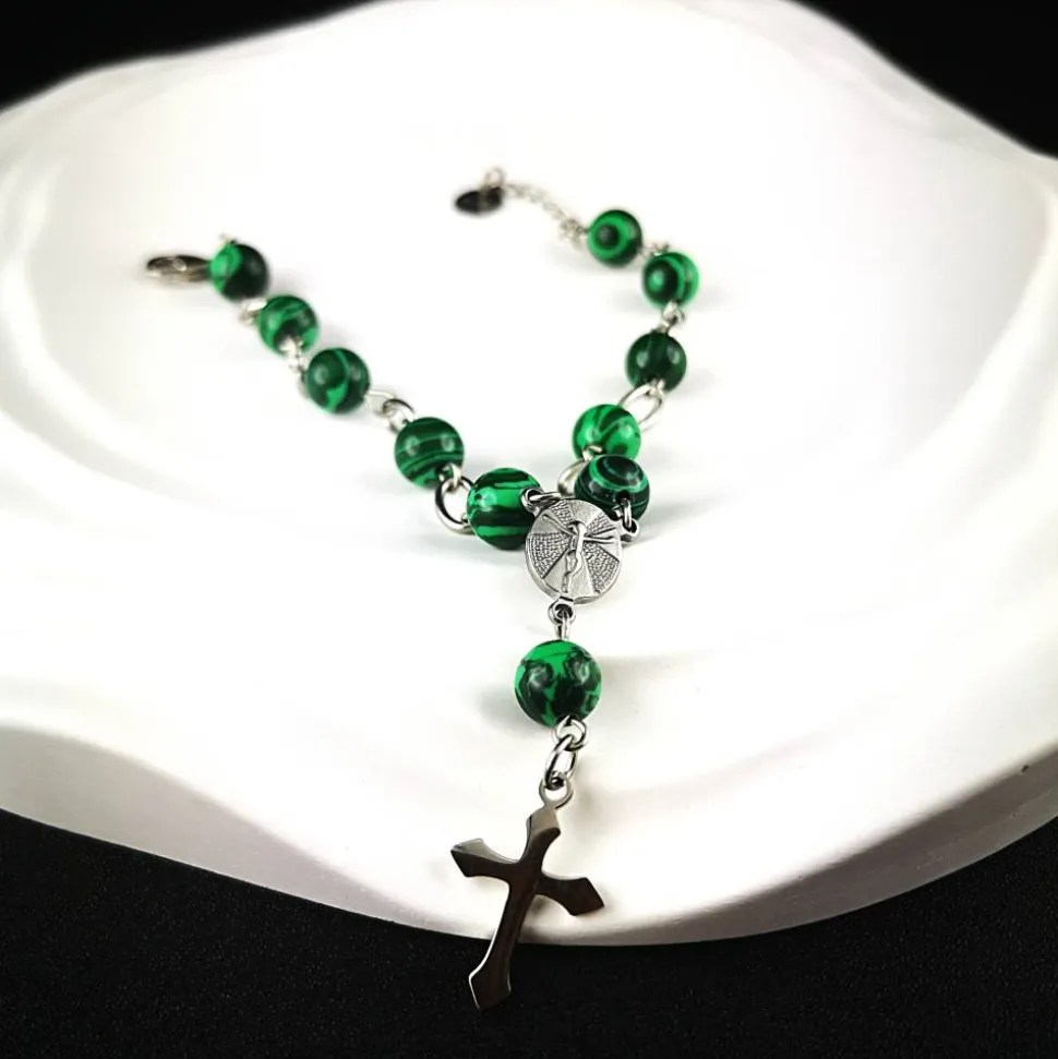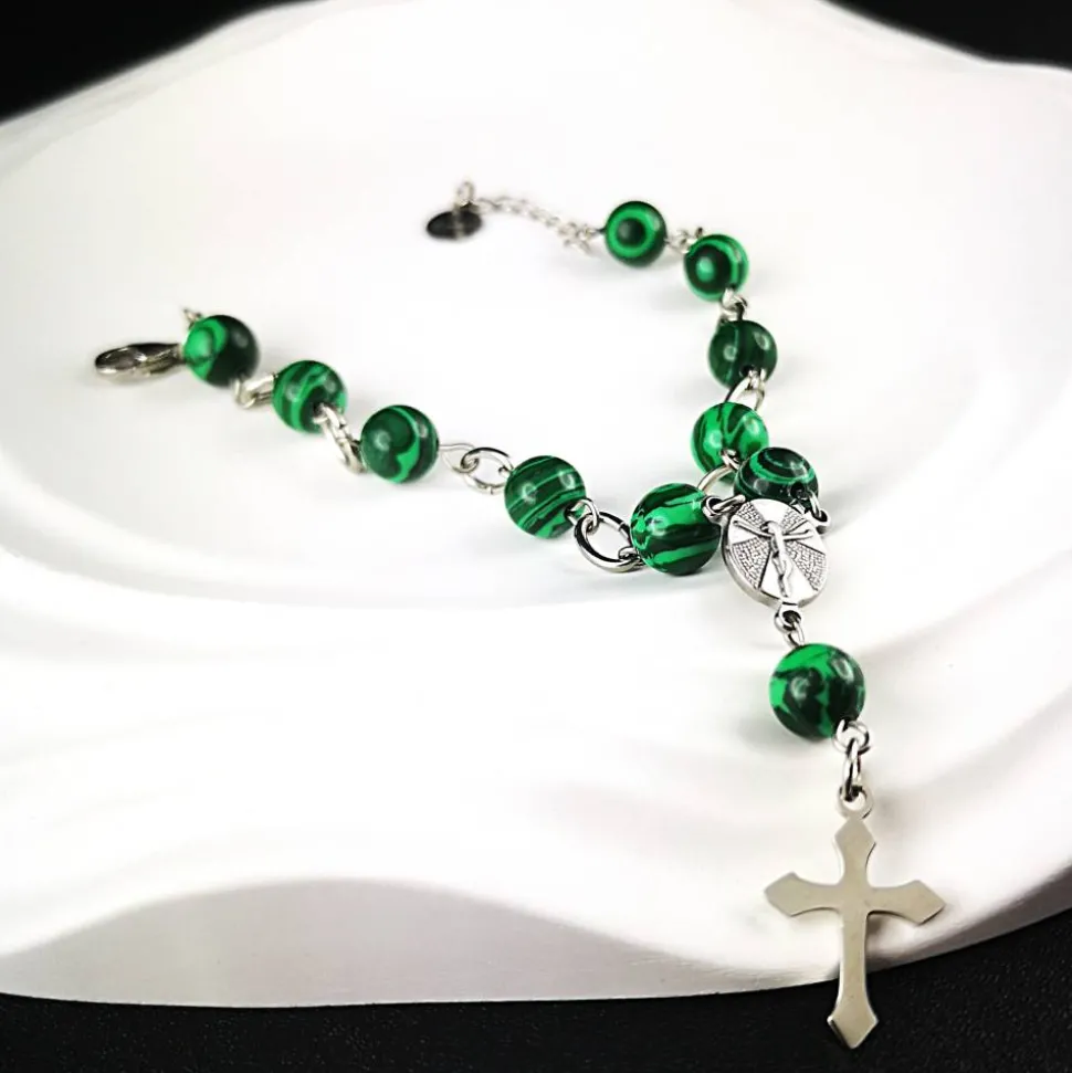 Dieses Rosenkranz-Armband ist das ideale Accessoire, um deinen Glauben mit Stil und Persönlichkeit zu zeigen. Lass dich von der Kombination aus Edelstahl, Malachitperlen und spiritueller Symbolik begeistern.