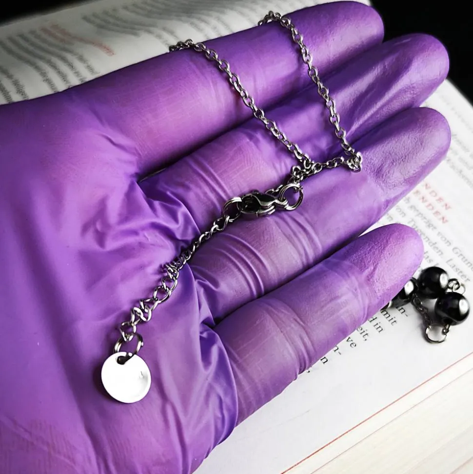 Die Rosenkranz-Halskette überzeugt durch ihre edle Basis aus Edelstahl und ist in vier Ausführungen erhältlich. Auf jeder Seite sind fünf Steinperlen aus Hämatit, synthetischem Malachit, Achat oder Tigerauge verarbeitet. Im Mittelpunkt steht ein beidseitig verziertes Herzstück, ergänzt durch eine gewählte Steinperle sowie ein kleines Kreuz. Die Kette aus Hämatitperlen wird standardmäßig mit einem Hämatitkreuz geliefert, kann auf Wunsch jedoch auch mit einem kleinen Edelstahlkreuz angefertigt werden.