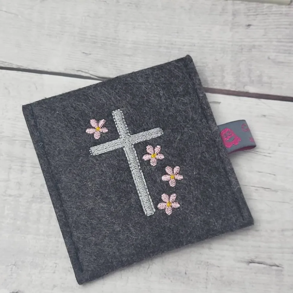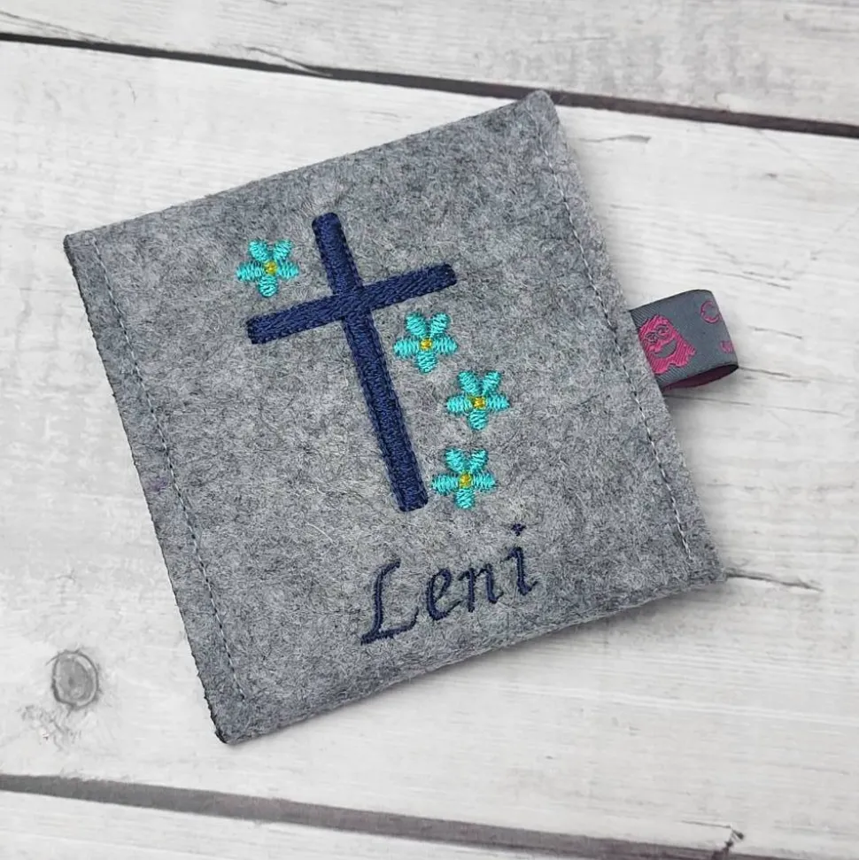 Sie können aussuchen welche Filzfarbe sie haben möchten. Auch die Stickfarbe der Stickerei kann frei gewählt werden.