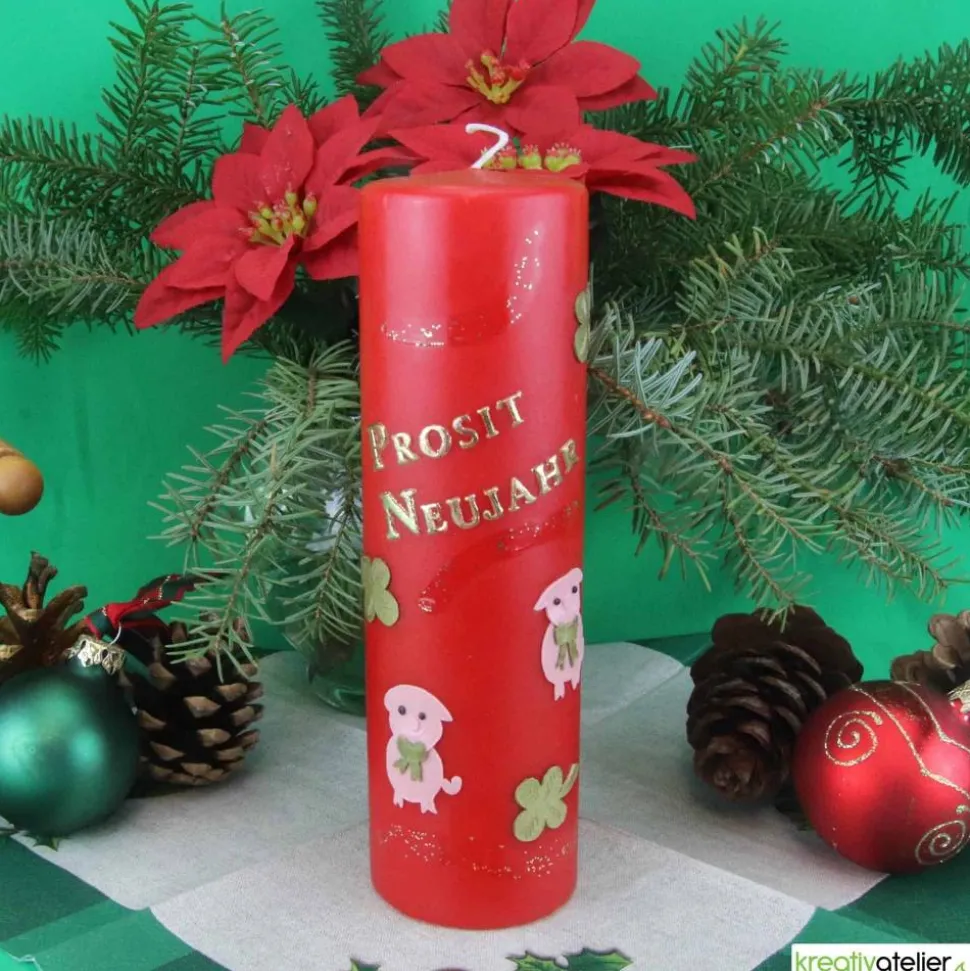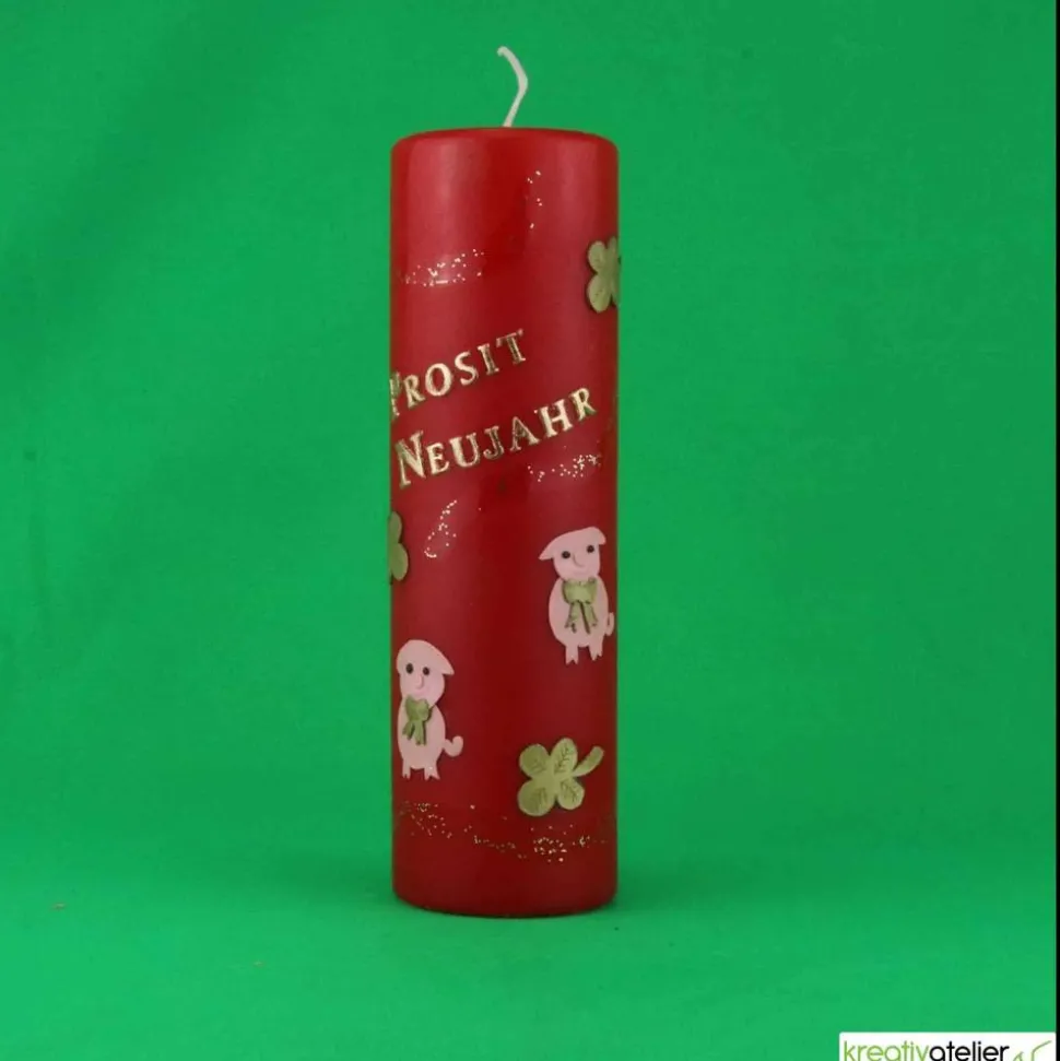 Meine Silvesterkerzen werden aufwändig von Hand mit Wachs verziert. Die beiden niedlichen Schweinchen sollen viel Glück im neuen Jahr bringen. Auch die goldenen Kleeblätter sind Glückssymbole. Der goldene Schriftzug „Prosit Neujahr“ ist fester Bestandteil der Kerze.