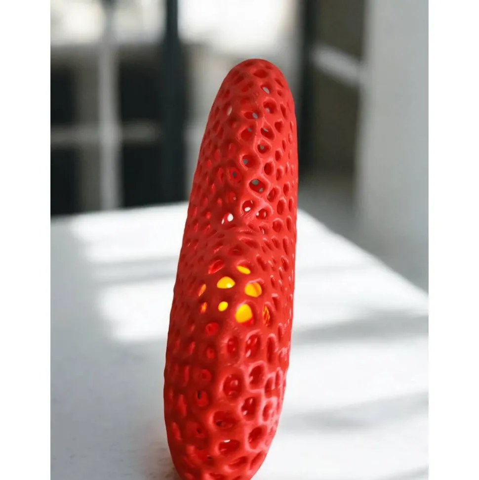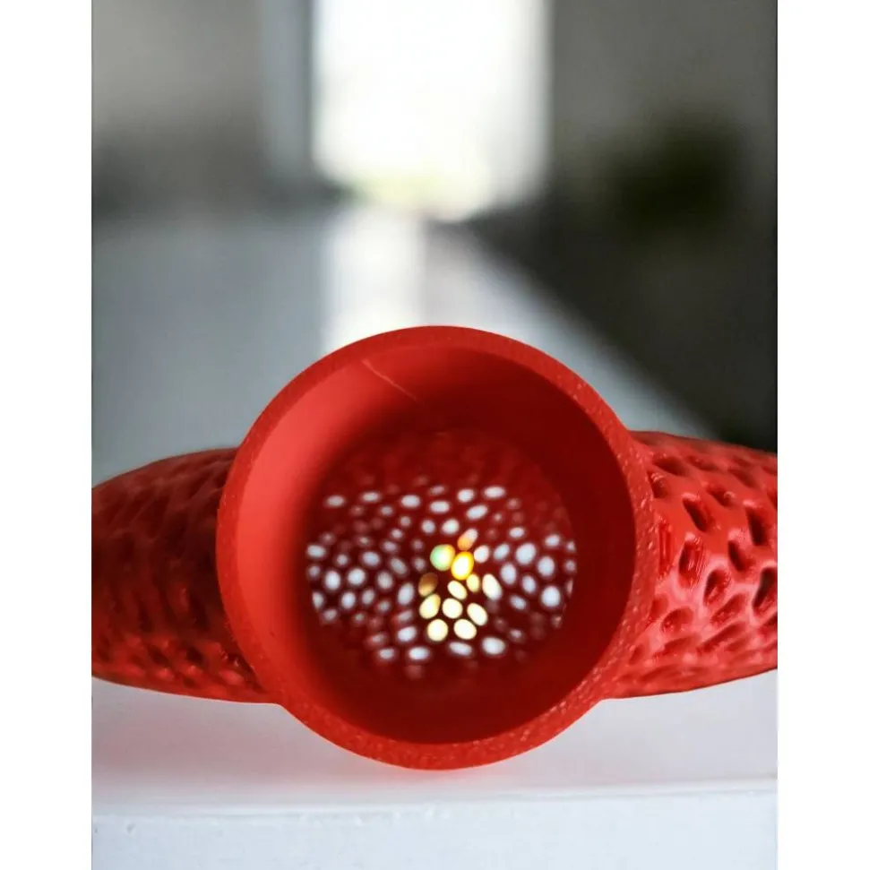 Der Halter ist mit einem komplexen, organisch inspirierten Lochmuster versehen, das an Korallen, Bienenwaben oder Schwämme erinnert – ein Blickfang mit subtilem Trypophobia-Touch, der bei Beleuchtung ein atemberaubendes Schattenspiel erzeugt.