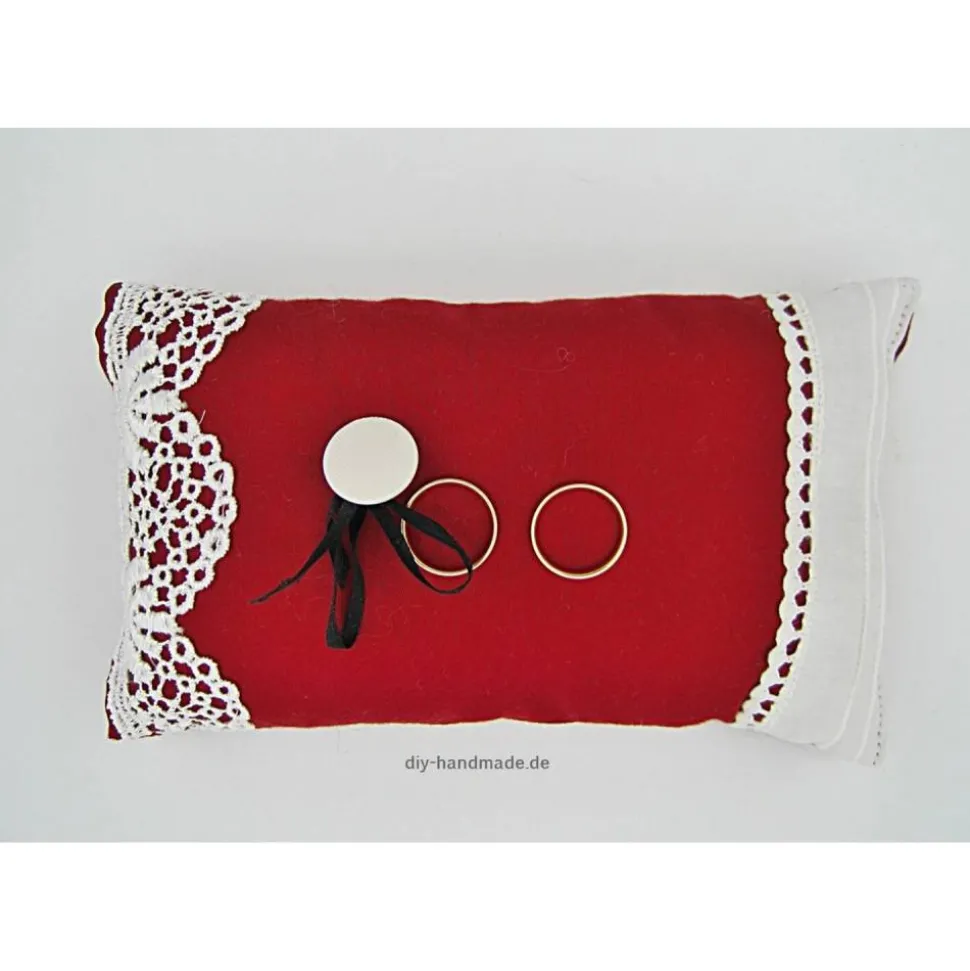 Weiße Antikspitzen aus reiner Baumwolle sind auf jeder Seite des roten Kissens aufgenäht und verleihen dem Kissen seinen einzigartigen Charme. Die Halterung für die Ringe besteht aus einem weißen Knopf und einem schwarzen Baumwollband – nicht alltäglich, sondern außergewöhnlich.