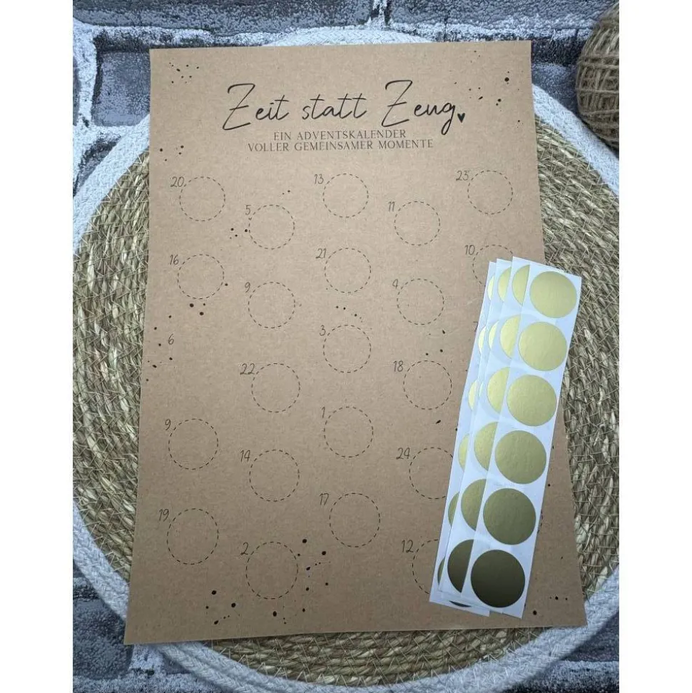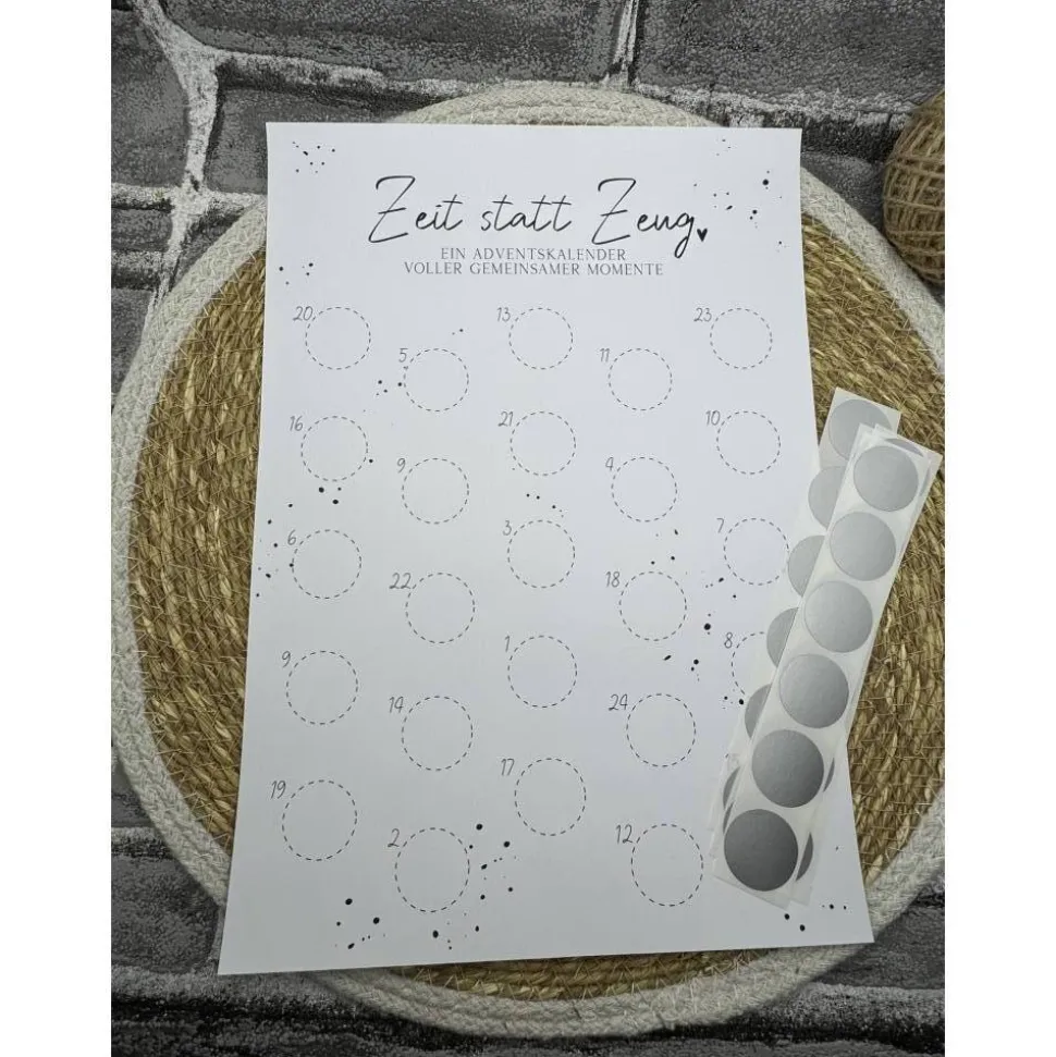Ihr beschriftet die Kreise und klebt einen Rubbel- Sticker darüber, die beschenkten rubbeln mit einer Münze, ein Feld des jeweiligen Tages frei.