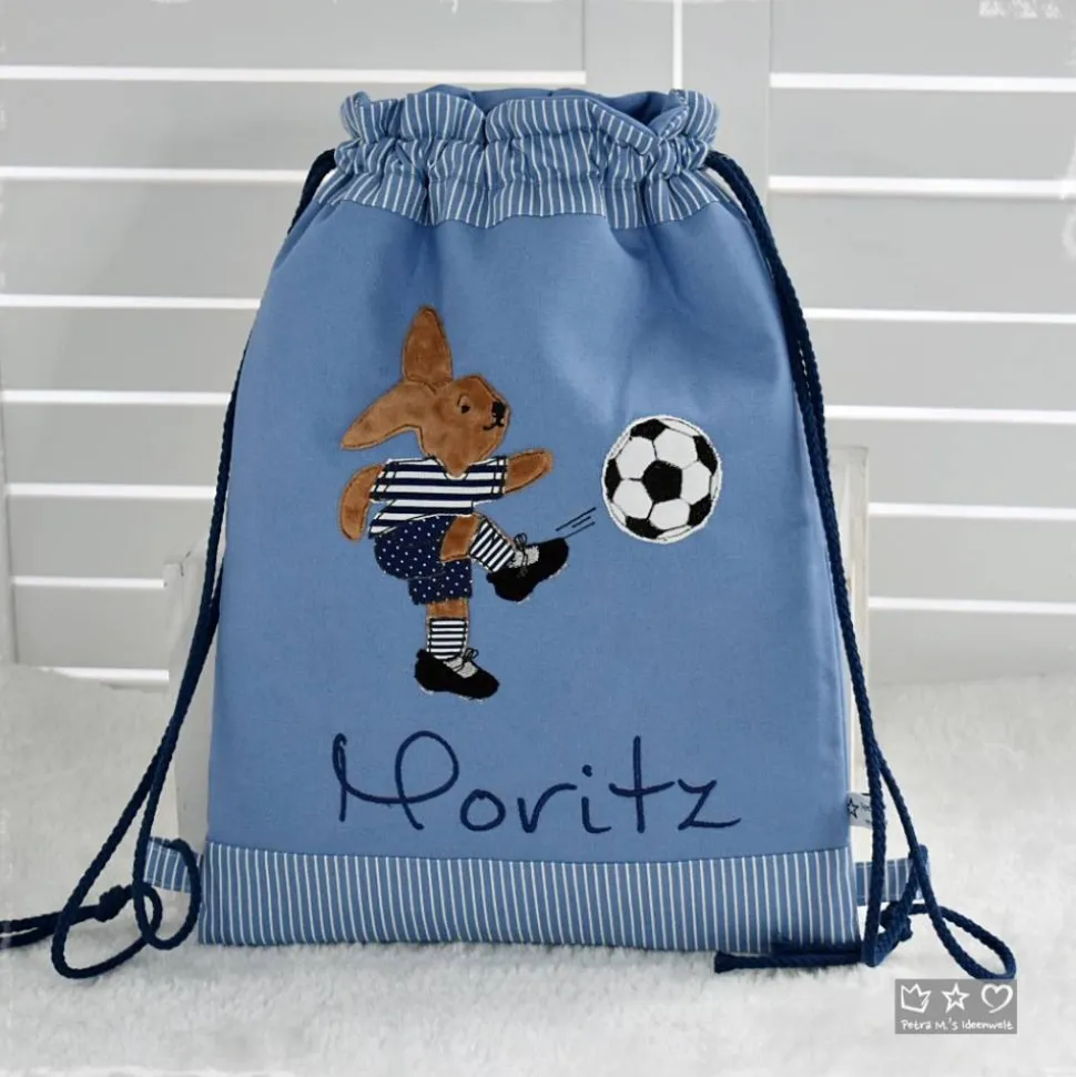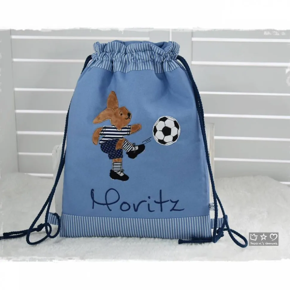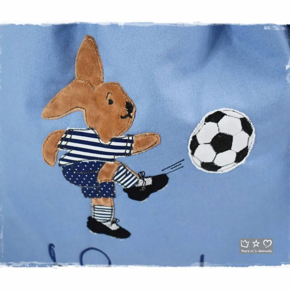 *Liebevoll genähter Rucksack-/Beutel in verschiedenen Größen aus hochwertigen Stoffen unterlegt mit Volumenvlies für mehr Stabilität. Auf der Vorderseite befindet sich eine Doodlestickerei ‚Hase mit Fußball‘ und auf