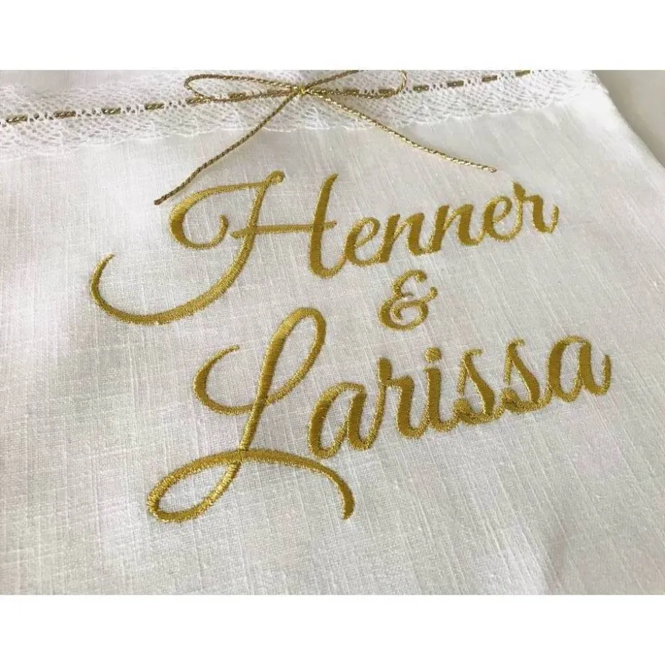 Die Farbe der Stickerei sowie die Namen und das Datum in Metallicgold
