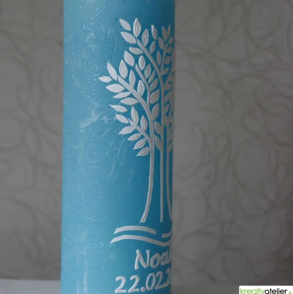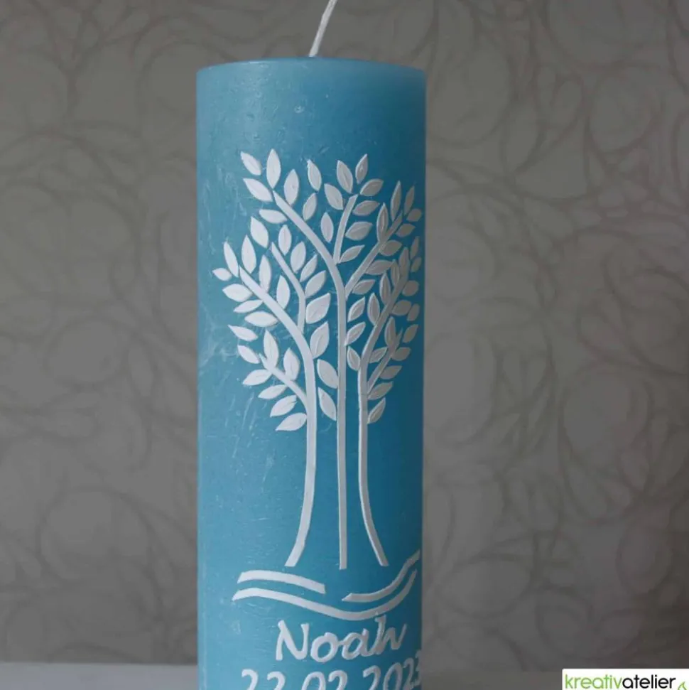 Das Herzstück dieser Taufkerze ist der wunderschöne weiße Lebensbaum. Mit seinem weißen Stamm, den Ästen und Blättern symbolisiert der Lebensbaum das kostbare Geschenk des Lebens und Wachstums. In seiner Reinheit verkörpert er die Unschuld und das neue Leben, das durch die Taufe in die Gemeinschaft aufgenommen wird. Jeder handgefertigte Zweig und jedes Detail des Lebensbaums wurde von mir mit liebevoller Sorgfalt aus echtem Wachs gestaltet und kunstvoll auf der Kerze platziert.
