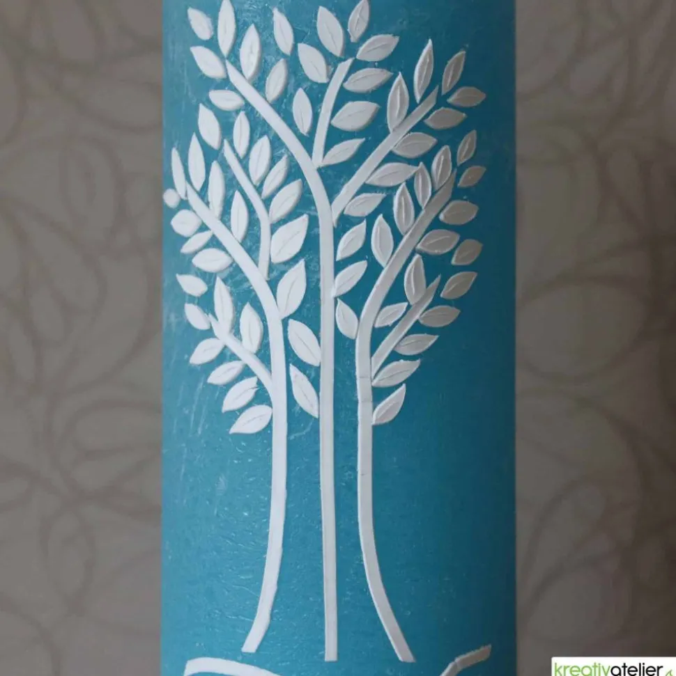 Alle Ornamente, Symbole und Verzierungen der Kerze werden von Hand aus echtem Wachs ausgeschnitten und kunstvoll auf der Kerze arrangiert, um ein wunderschönes und einzigartiges Gesamtbild zu erzeugen. Keine Folie. Kein Druck.