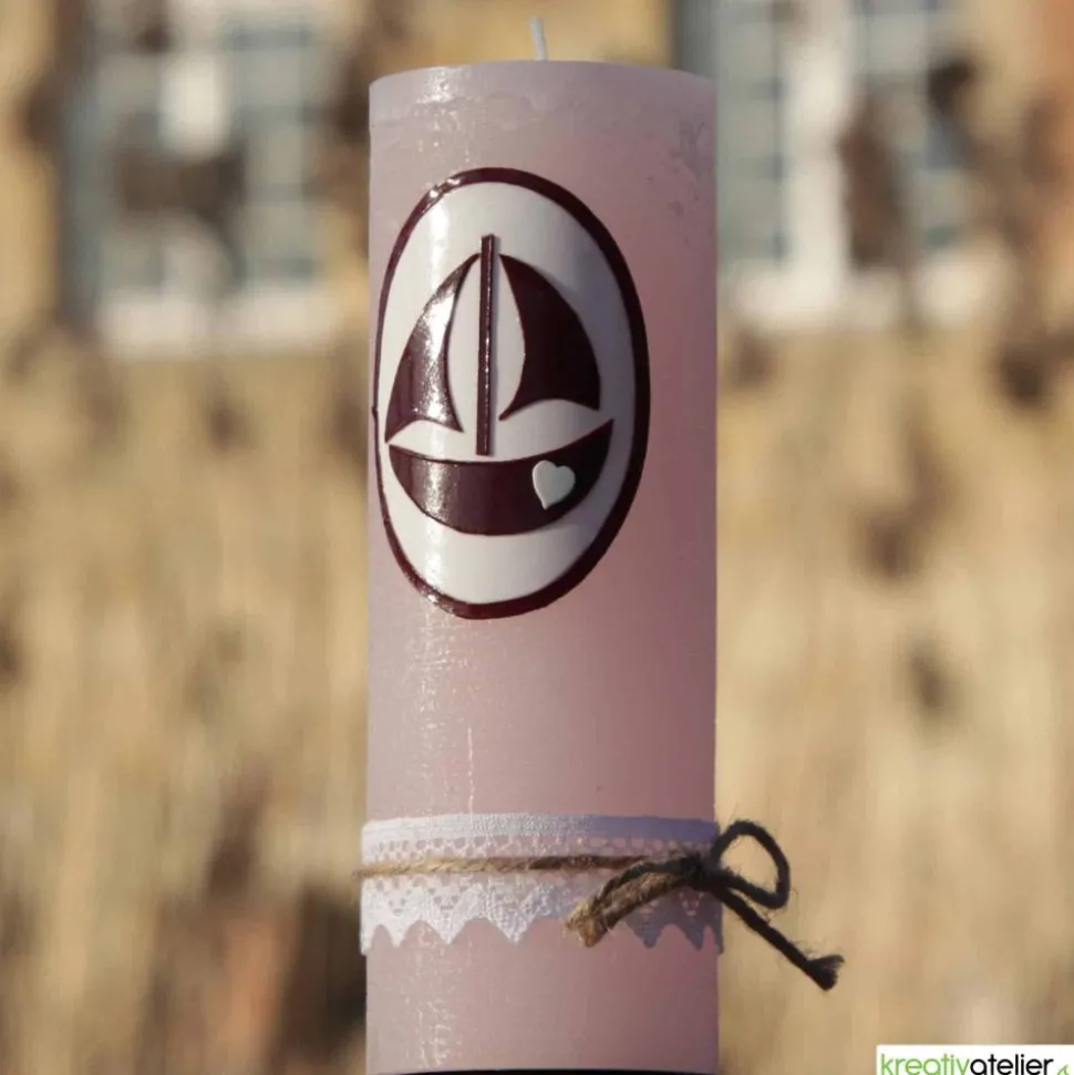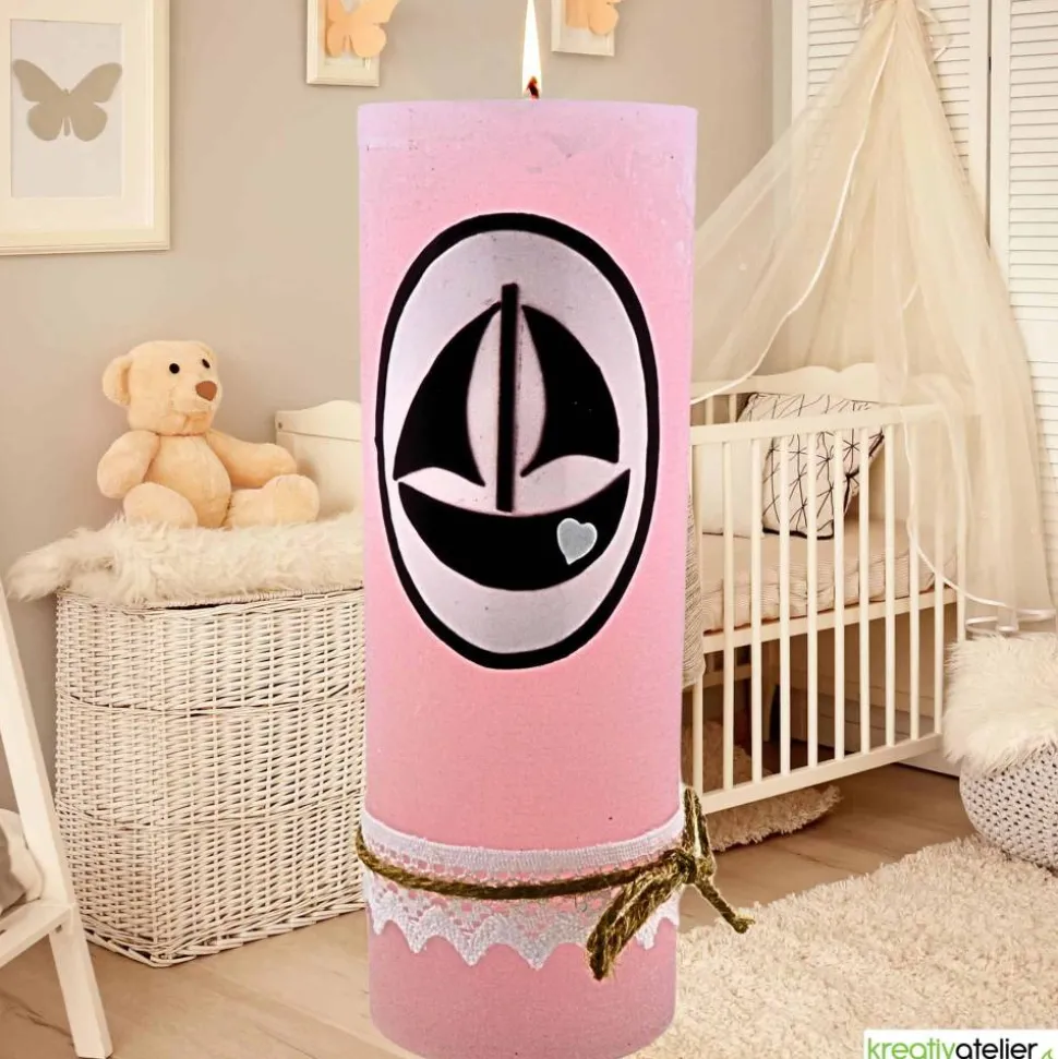 Diese handgefertigte Geburtskerze trägt eine tiefe symbolische Bedeutung. Das Licht der Kerze steht für das neue Leben und die Freude, die das Kind in die Welt bringt. Das Segelschiff symbolisiert die Reise des Lebens, die das Kind beginnt, und die Klöppelspitze verleiht der Kerze eine besondere Eleganz und Zartheit. Die Kombination aus rosa Wachs, der liebevollen Gestaltung und den natürlichen Materialien wie Jutekordel und Klöppelspitze schafft eine warme und einladende Atmosphäre.
