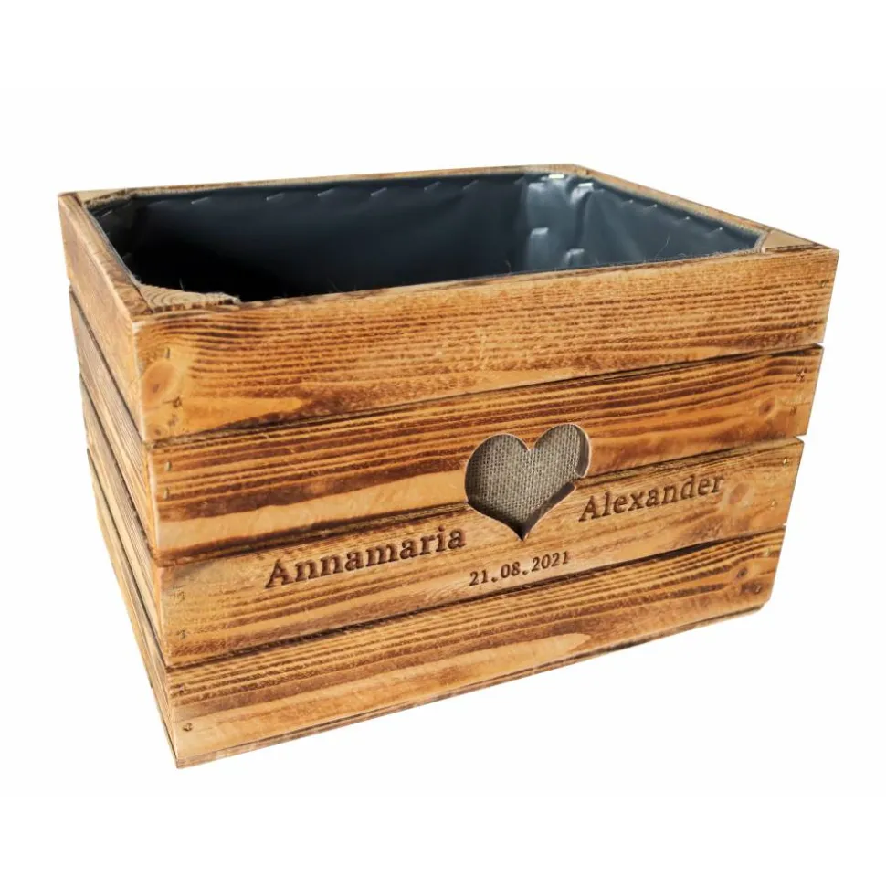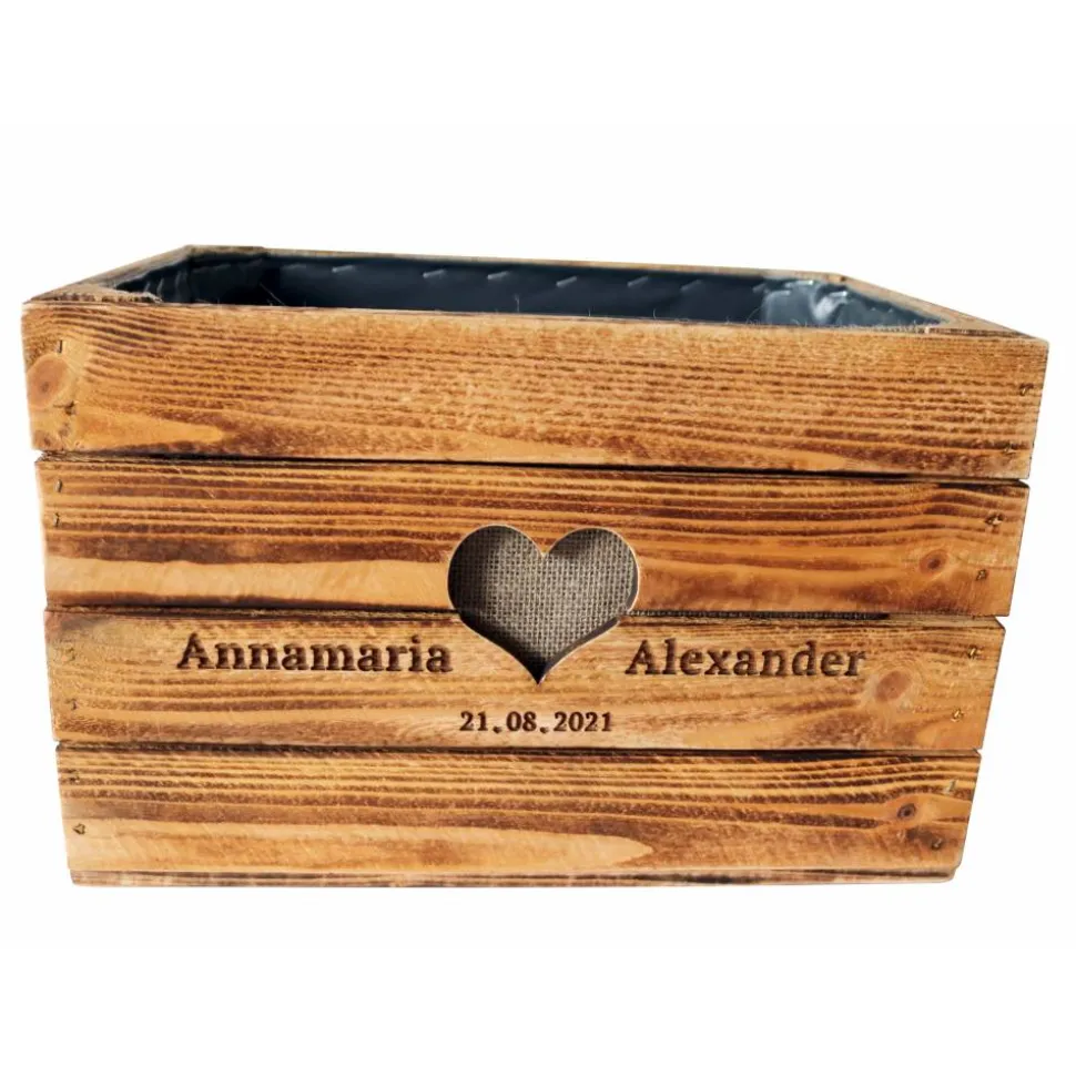 Die Vornamen des Brautpaares und das Hochzeitsdatum werden nach Wunsch -wie auf den Bildern- stilvoll in der Kiste eingraviert. Ein ausgeschnitztes ❤️ verbindet die beiden Namen miteinander.