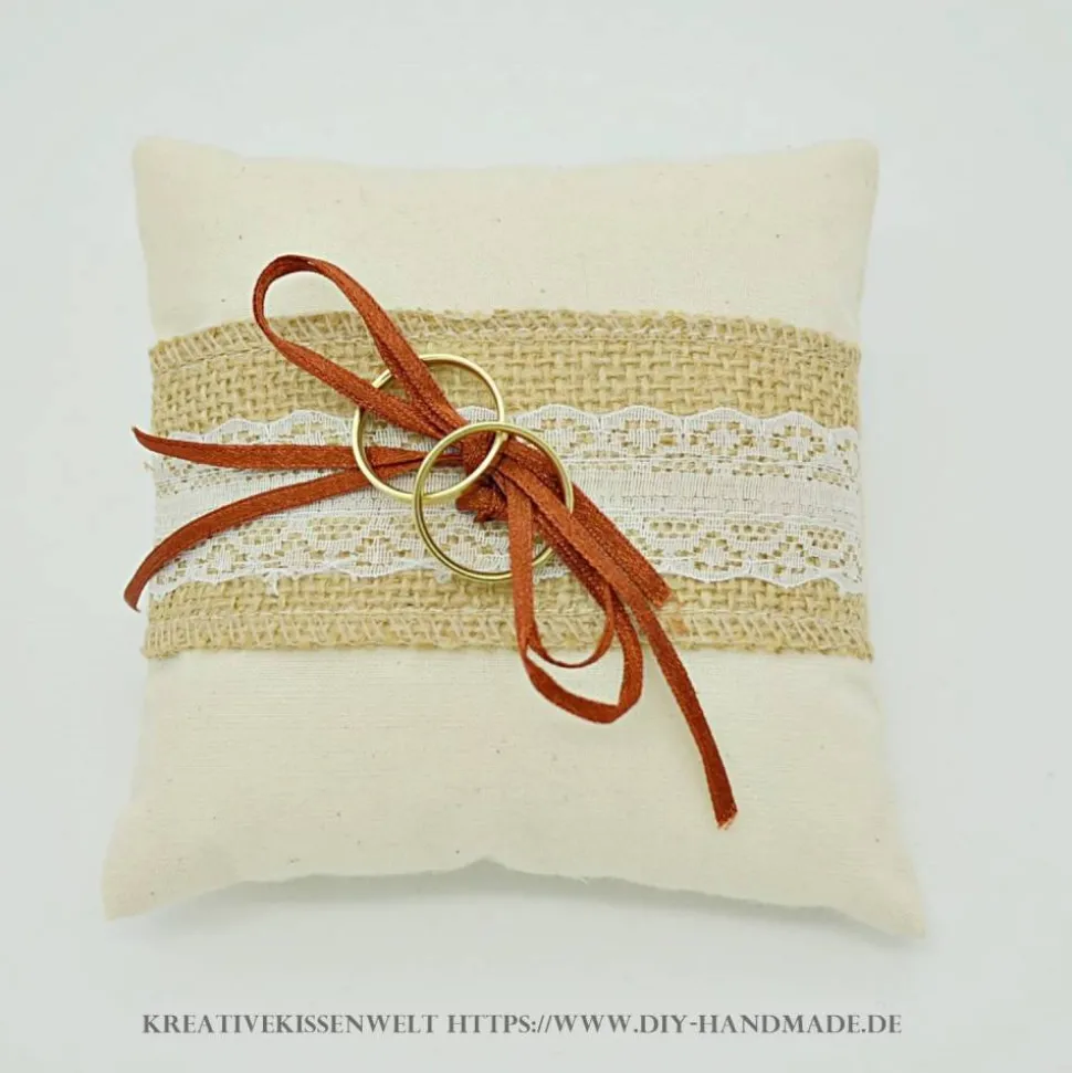 Bindebänder aus reiner Baumwolle in Rost sorgen für sicheren Halt Deiner Ringe. Farblich überzeugt das Kissen in Creme, Rost, Beige und Weiß.