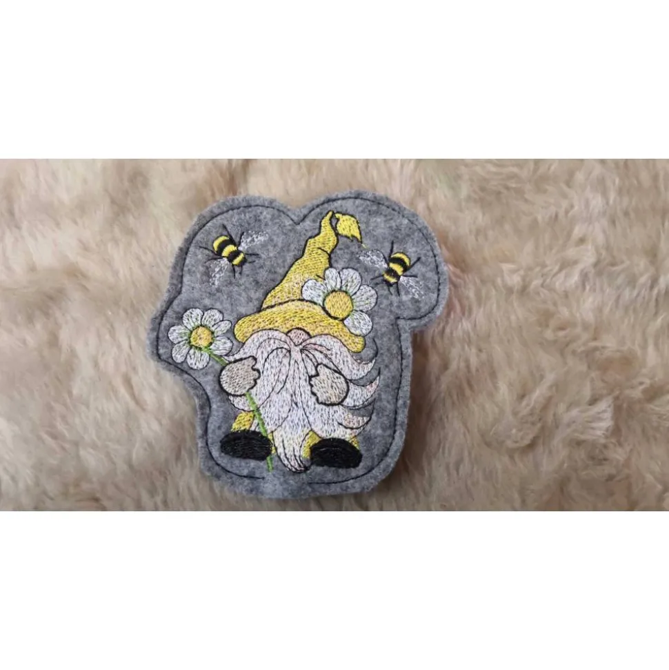 Der Blumenstecker ist aus Polyesterfilz und mit Polyestergarn bestickt. Das Motiv ist ein Gnom mit Bienen.