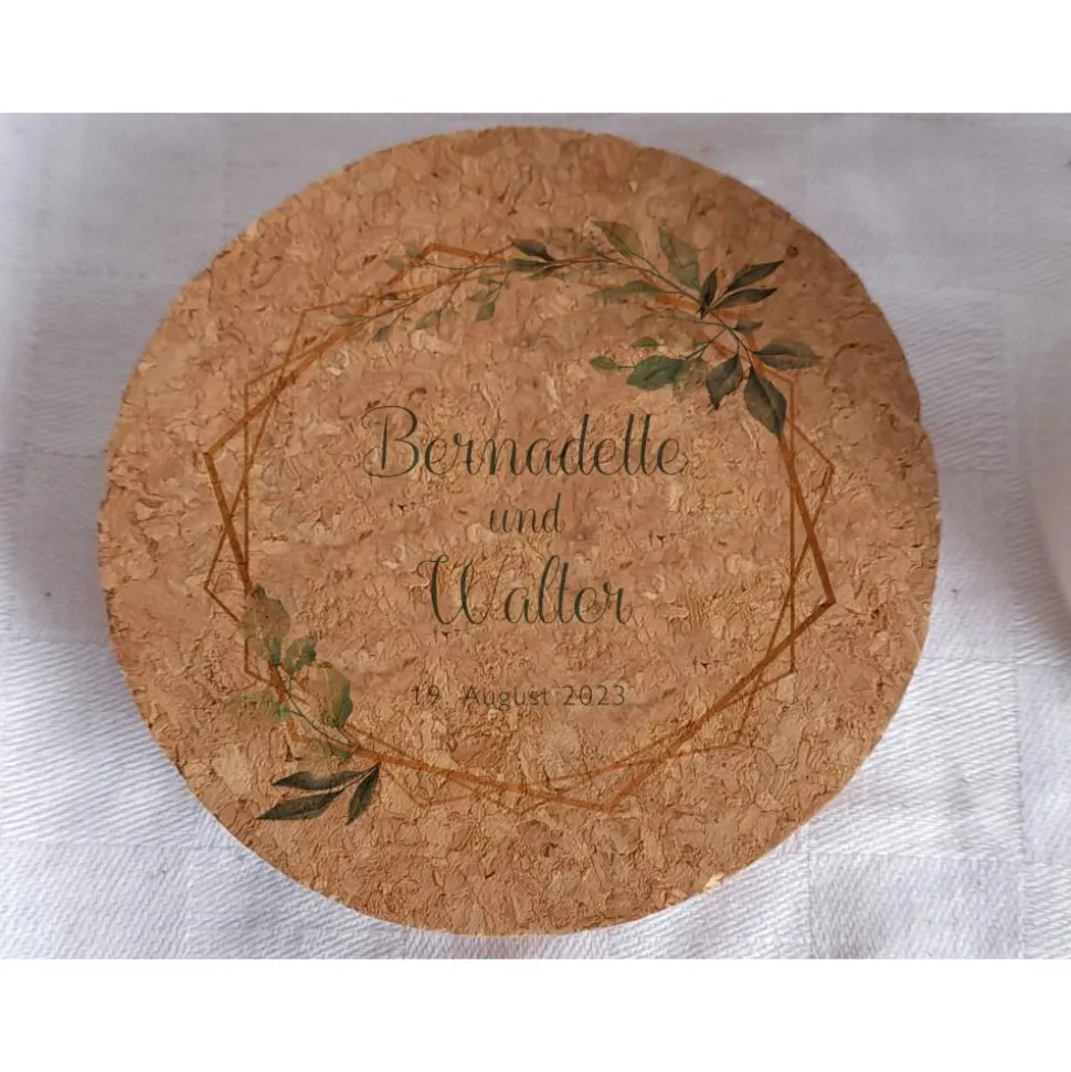 Das Korkglas ist 18,5 cm hoch und hat einen Durchmesser von 9,5 cm. Es kommt mit einem Korkdeckel der auf Wunsch ebenfalls bedruckt ist.