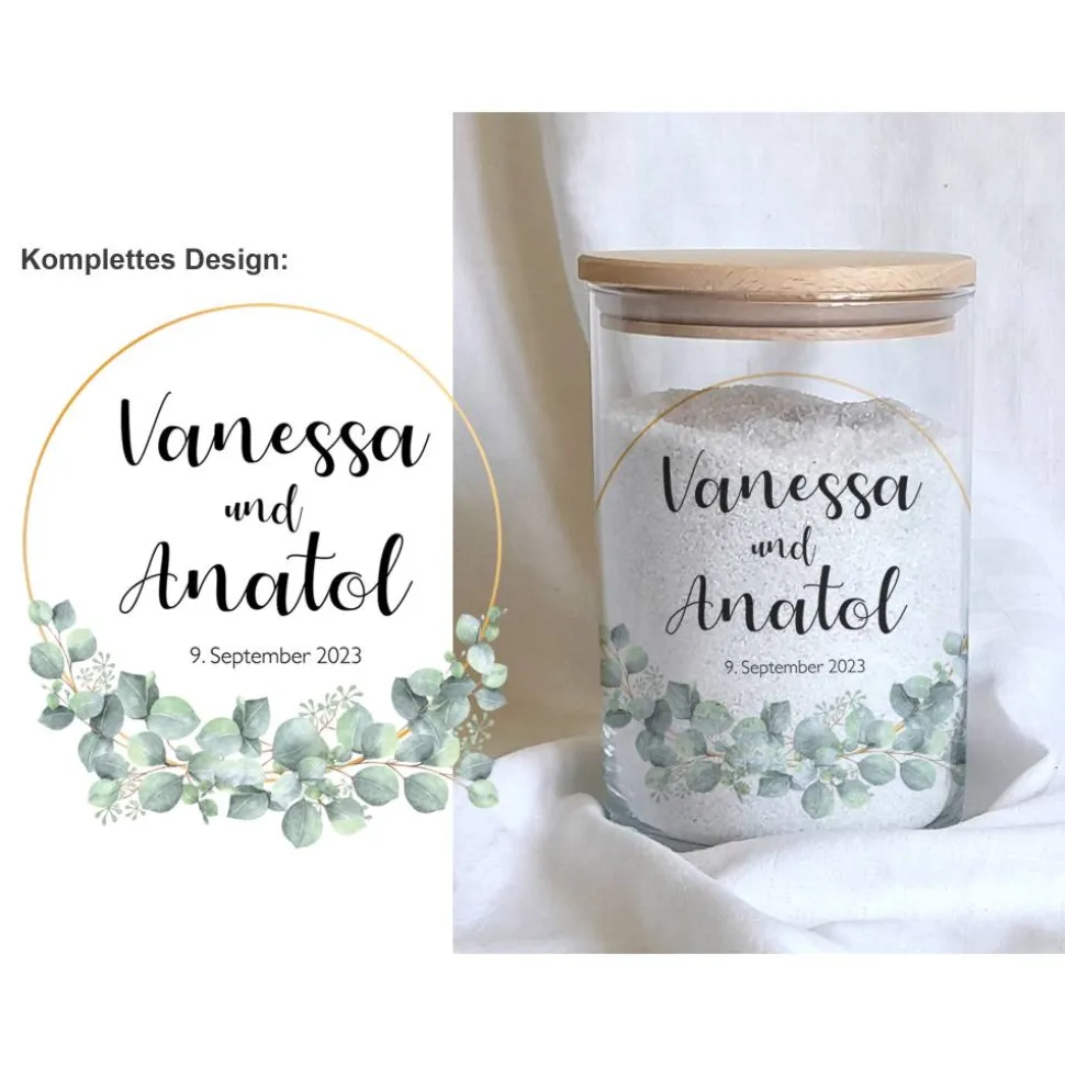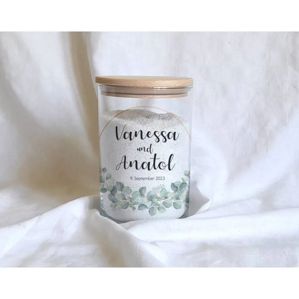 Sandzeremonie Glas mit Holzdeckel Hochzeitsbrauch Windlicht Design Eukalyptus unten