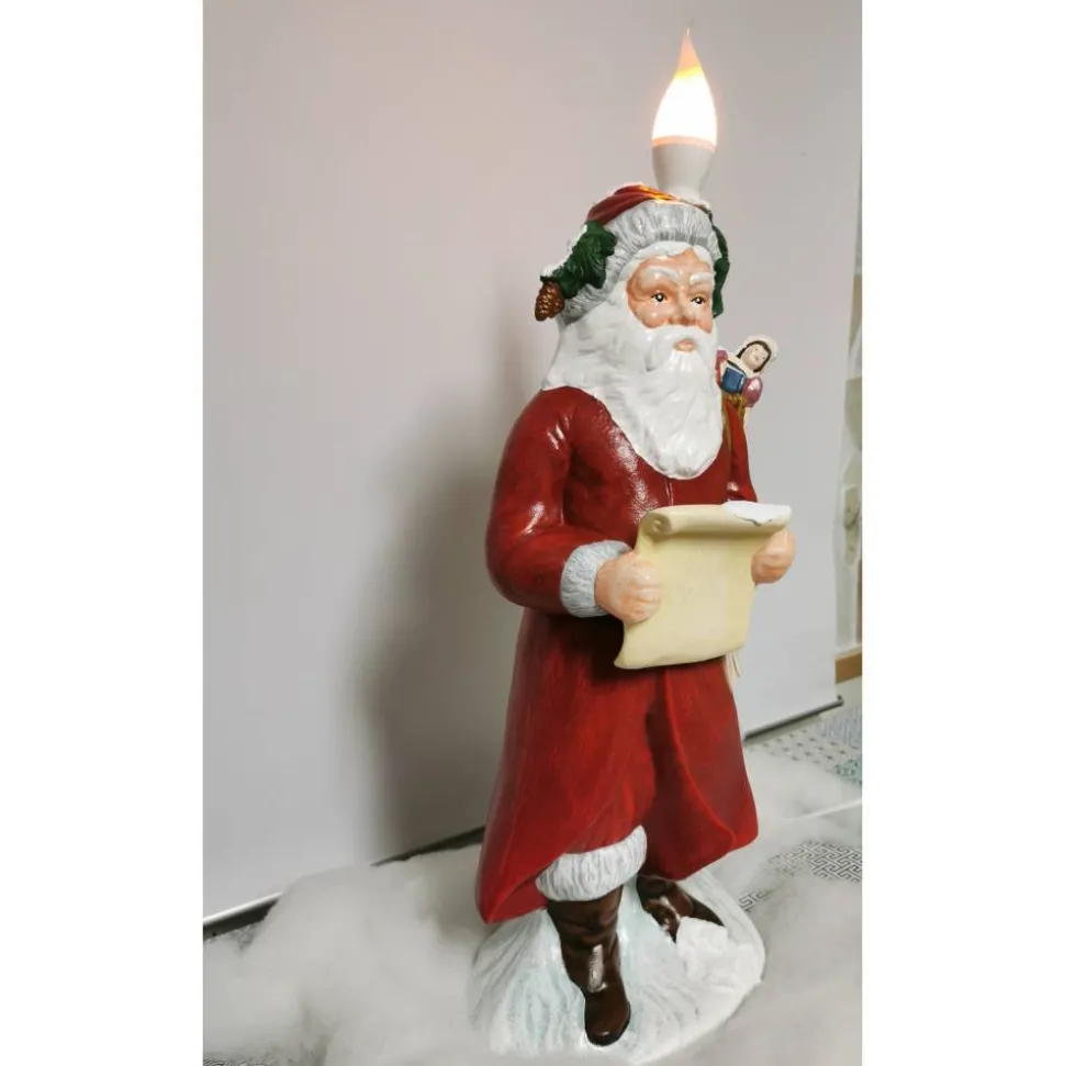 Der Santa ist ca 59cm hoch, Material ist Keramik. Die Figur ist aufwendig bemalt und zweimal wetterfest versiegelt. Er kann draussen stehen, sollte aber vor Frost geschützt werden. Im Lieferumfang ist ein Euro Kabel mit An und Ausschalter, 2m Länge und eine LED Glühlampe in Tropfenform enthalten.