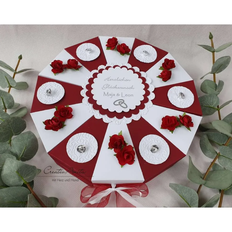 12 einzelne Tortenstücke, jedes einzeln nach Belieben befüllbar (z. B. mit Geld, Gutschein, Mini-Schafmilchseifen, Hochzeitsmandeln, Sprüchen, Süssigkeiten usw.)