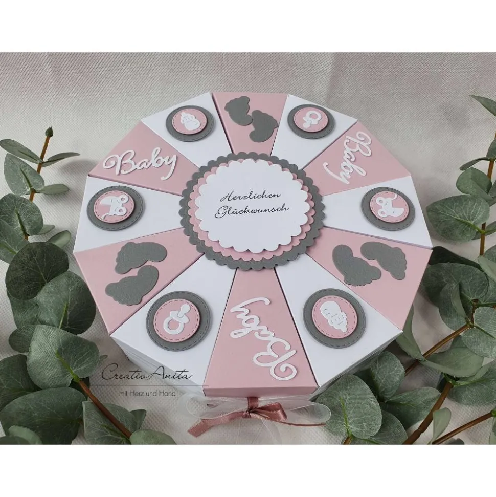 12 einzelne Tortenstücke, jedes einzeln nach Belieben befüllbar (z.B. mit Geld, Gutschein, Sprüchen, Süssigkeiten, Babyaccessoires usw.)