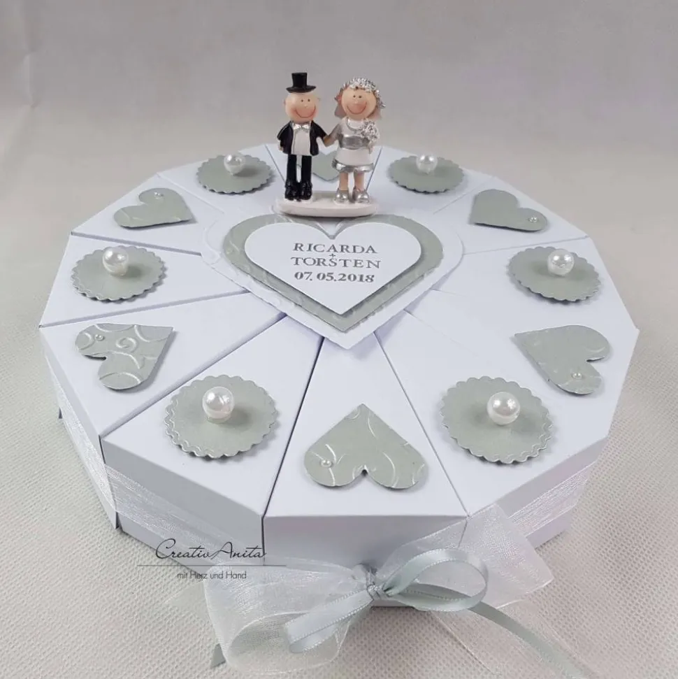 Material: kräftiger Tonkarton, Stanzelemente, Perlen, Schleifenband, anlassbezogene Deko, beschriftbarer Aufleger, Tortenaufsatz: wahlweise „Silberpaar“ (Polyresin)oder Taubenpärchen