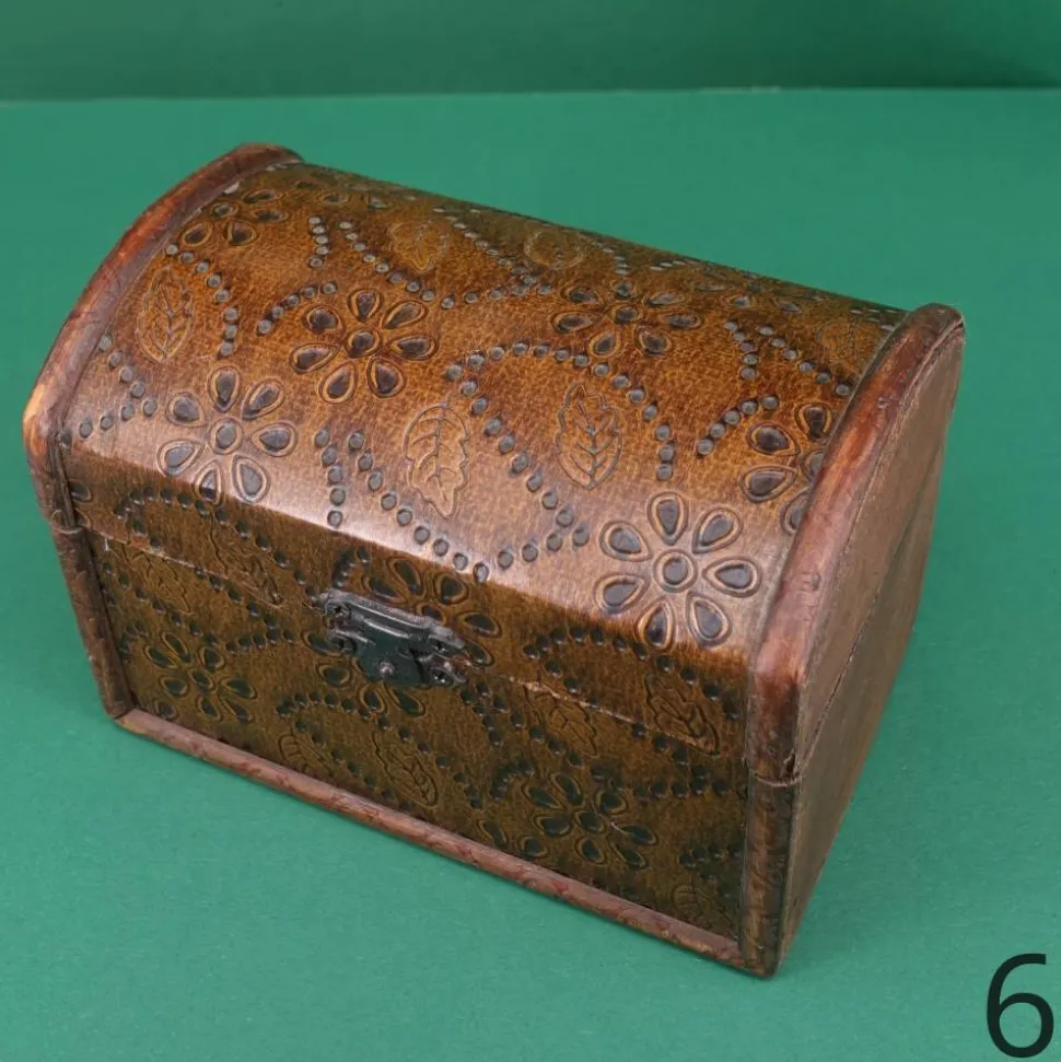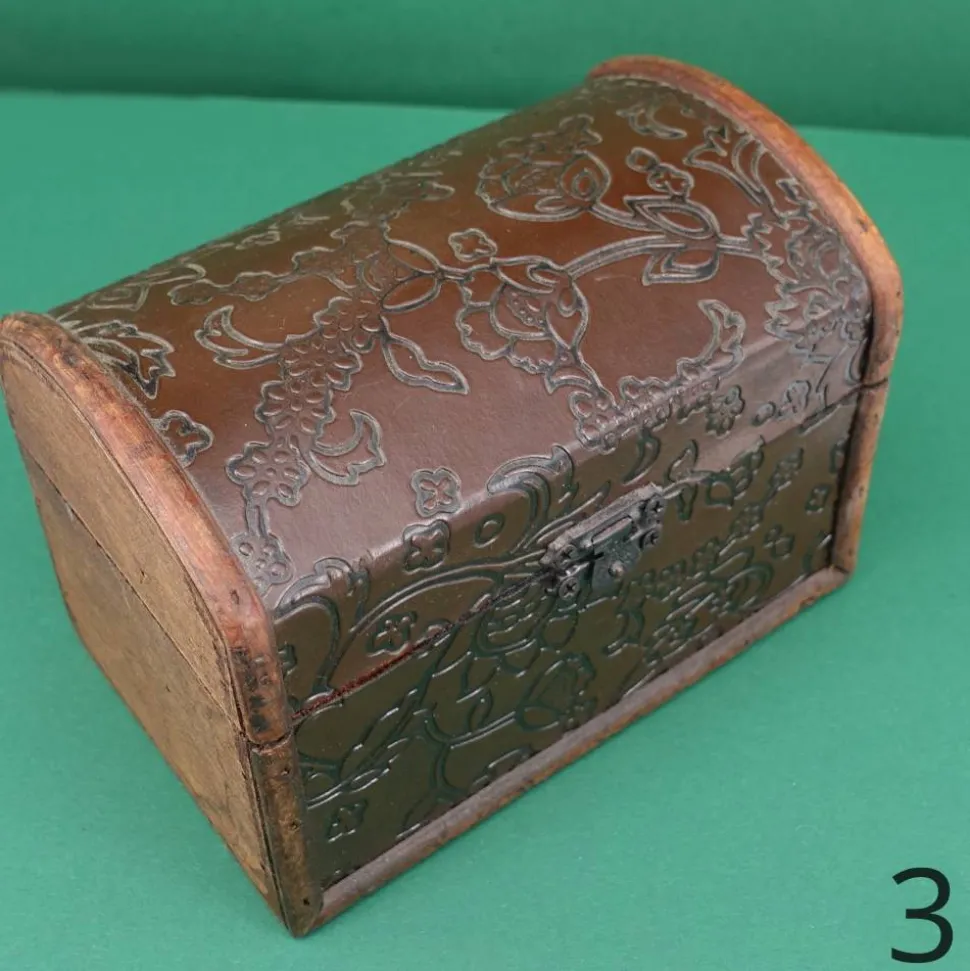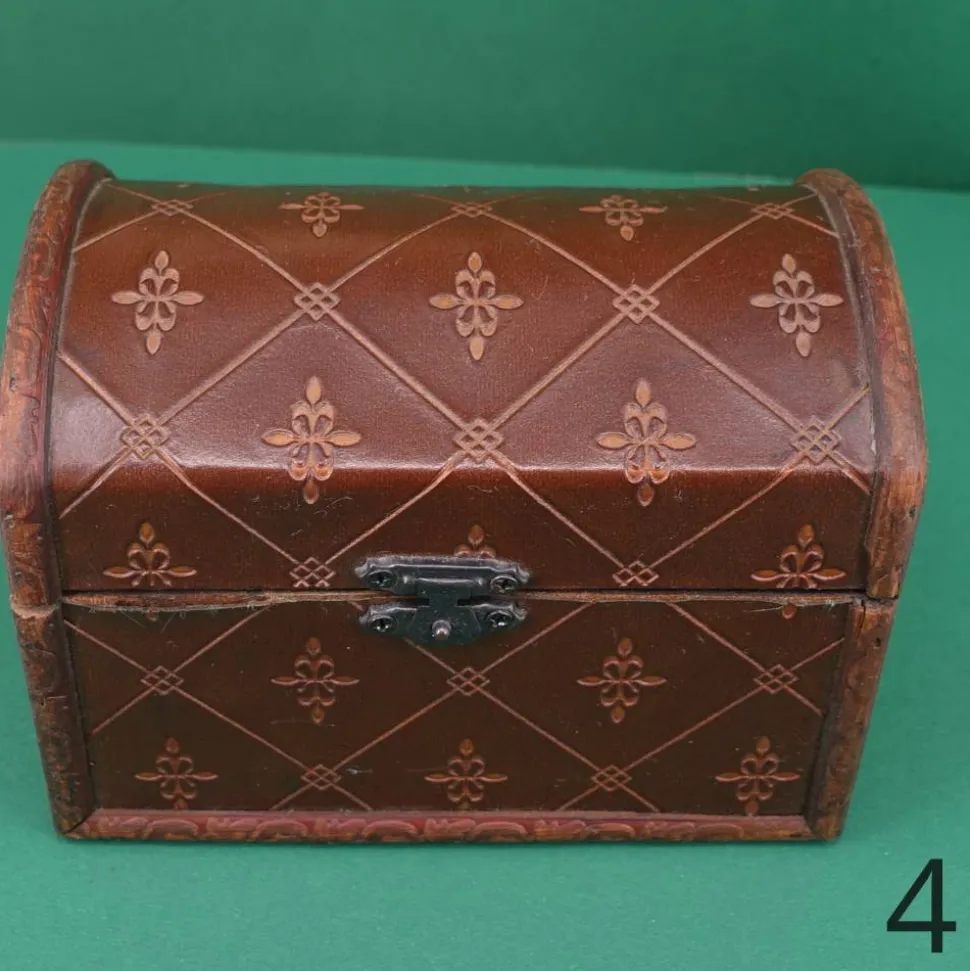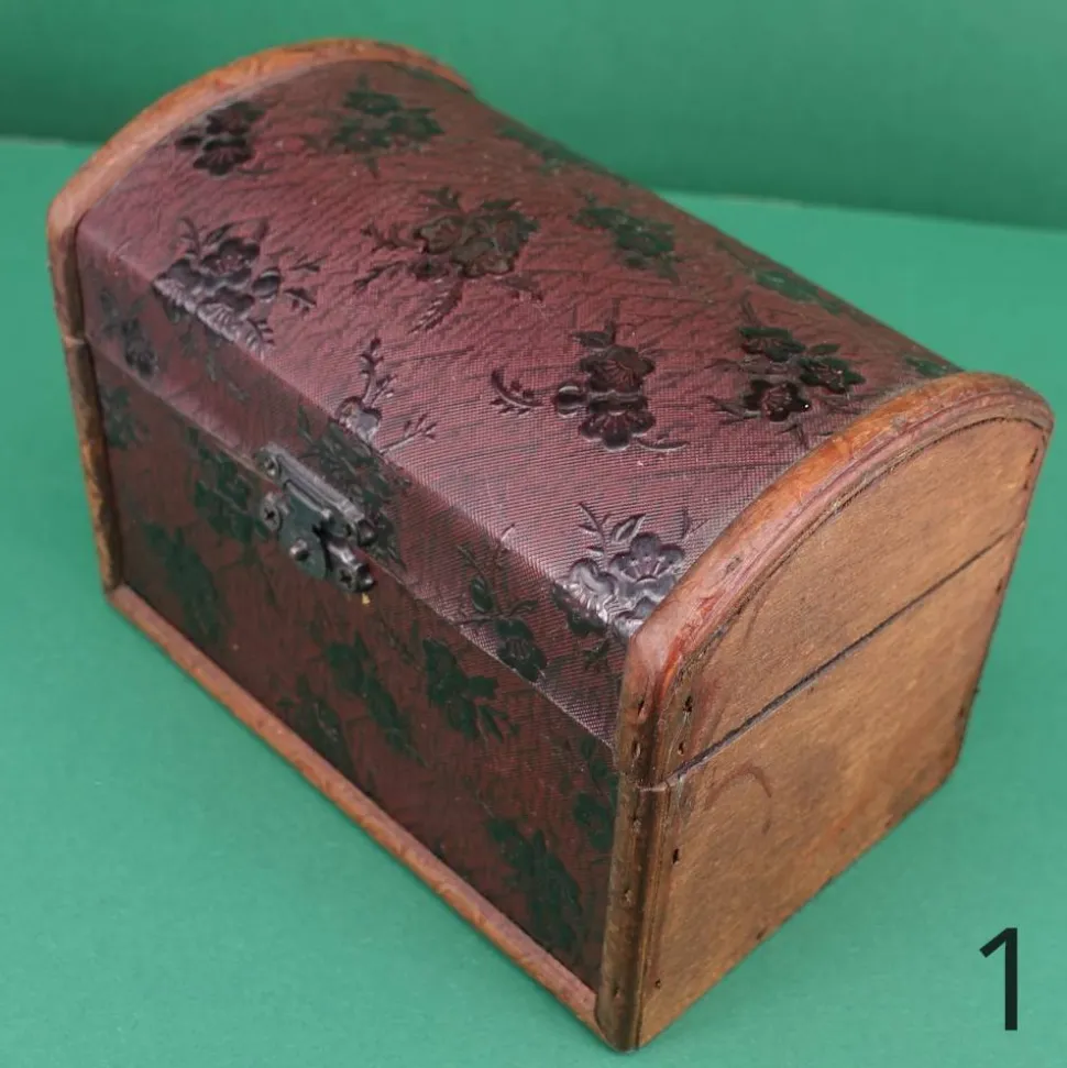 Diese kleine Truhe sieht aus, als wäre sie von früher. Der Korpus besteht aus Sperrholz, der Bezug ist wohl eine Prägefolie. Sie eignet sich als Geld- oder Geschenkverpackung ebenso wie als Schatztruhe für die ersten Kostbarkeiten von Kindern. Diese Truhen sind nicht perfekt gearbeitet, das verstärkt aber noch den Vintage-Charme.