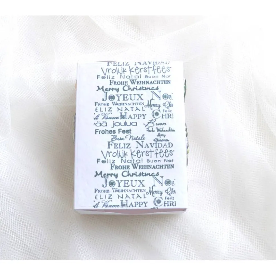Schiebeschachtel (Nr. W3) mit Stempelmotiv „Frohe Weihnachten“ in verschiedenen Sprachen in weiß-grün. Auf den Seiten sind kleine Weihnachtmotive aus Puffy-Stickern angebracht. Sie eignet sich zum Verschenken von Geld, Gutschein, Schmuck, Süßigkeiten und sonstigen kleinen Geschenken. Die Schachtel ist aufschiebbar und kann wieder verwendet werden.