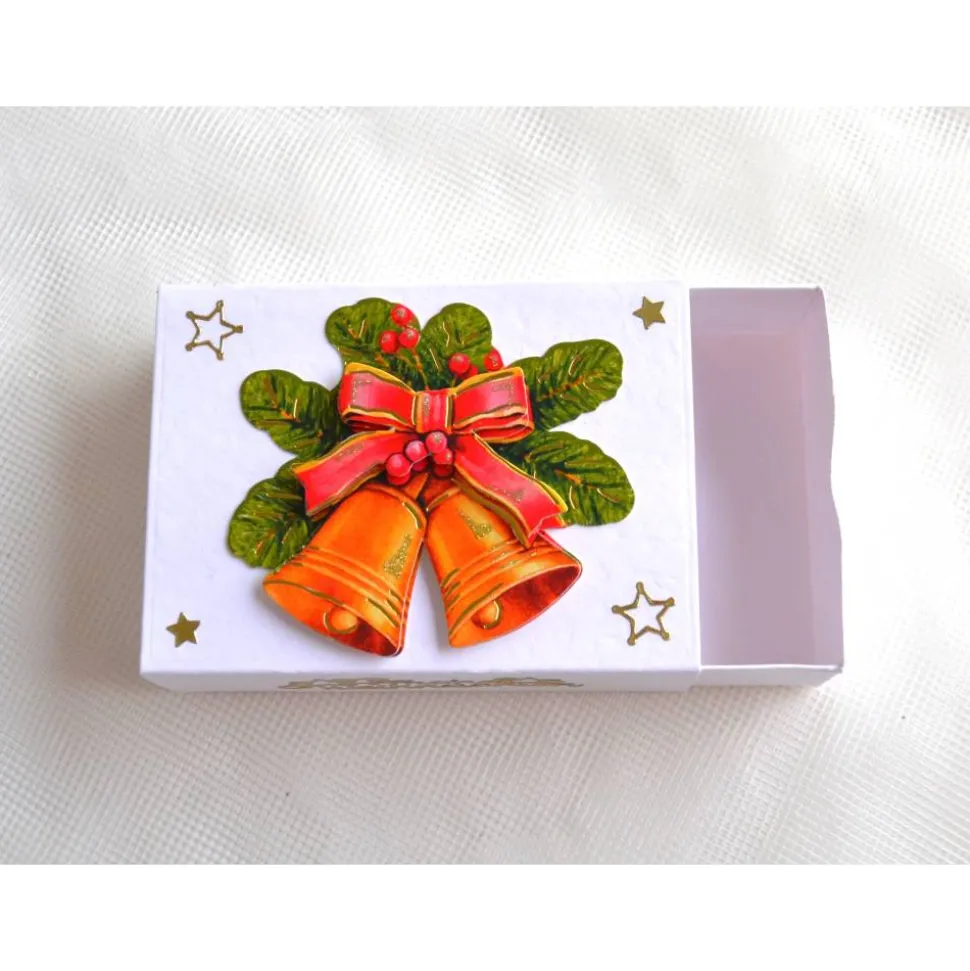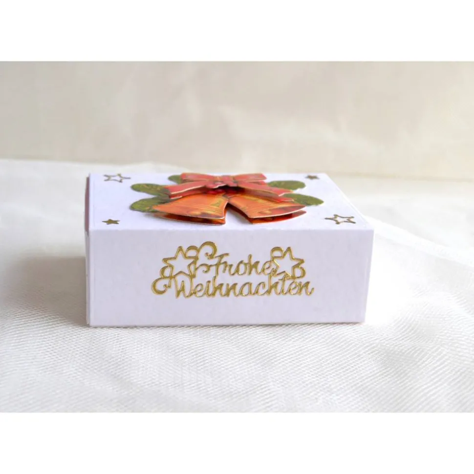 Schiebeschachtel (Nr. W5) mit 3D-Motiv Glocken und „Frohe Weihnachten“ auf der Seite. Sie eignet sich zum Verschenken von Geld, Gutschein, Schmuck, Süßigkeiten und sonstigen kleinen Geschenken. Die Schachtel ist aufschiebbar und kann wieder verwendet werden.