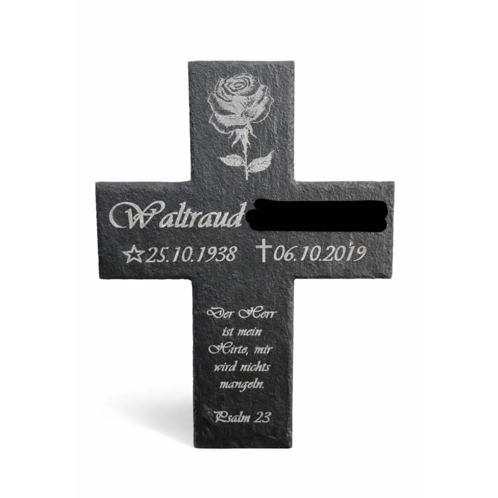 Verewige die Erinnerung an deine Liebsten mit einem personalisierten Schieferkreuz in der Größe 30x20cm. Unser Schieferkreuz ist eine einfühlsame und langlebige Gedenktafel, die speziell für den Außenbereich gefertigt wurde. Mit moderner Lasergravur kannst du Namen, Daten oder persönliche Botschaften präzise und dauerhaft aufbringen lassen.