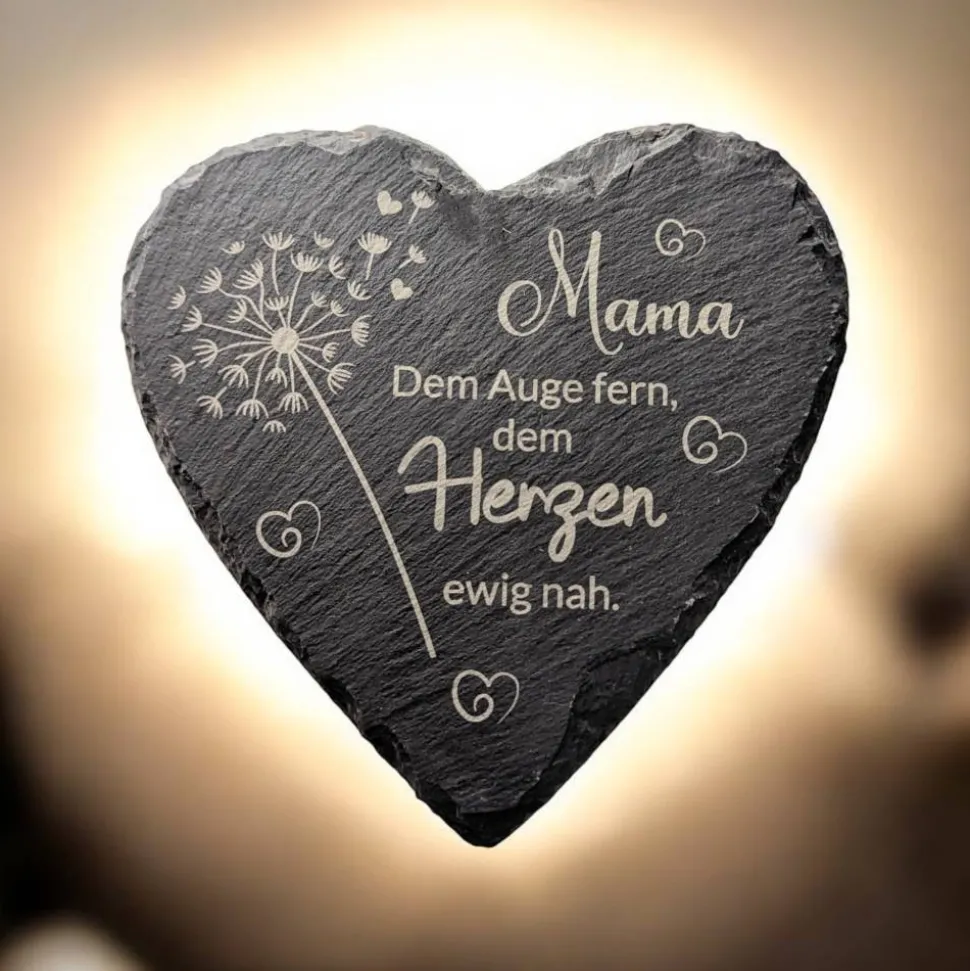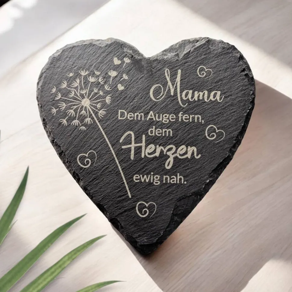 Die Gravur erfolgt per Laser, der millimeter-genau in den Schiefer „lasert“ und ihn dabei verfärbt. Fälschlicher Weise wird dies manchmal als „Druck“ bezeichnet. Es handelt sich jedoch um eine Lasergravur, die unverwüstlich und somit auch wetterfest ist. Eine spürbare Vertiefung des Schiefers erfolgt bei einer Lasergravur nicht. Bei der Verwendung in freier Natur kann es nach einiger Zeit zu leichtem Ausbleichen des Schiefers kommen. Die Schieferplatte kann mit leicht feuchtem, fusselfreien Tuch gesäubert werden.