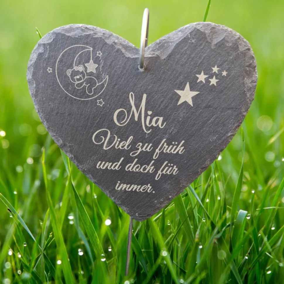 Bild und Schrift werden mittels modernsten Hochleistungs-Lasern fest im Schiefer eingebrannt. Die Grabplatte wird also nicht bedruckt oder beklebt. Die Gravur ist wetterbeständig und nutz sich auch bei dauerhafter Sonneneinstrahlung nicht ab.