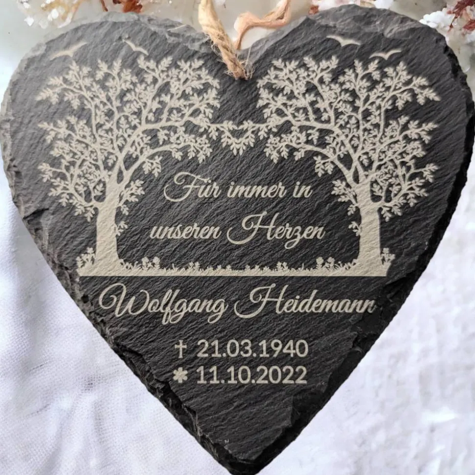 Bitte beachte, dass Schiefer ein Naturprodukt ist und niemals eine Schieferplatte der anderen gleicht. Unterschiedliche Stärken oder kleine Hügel sind bei einem Naturprodukt die Regel. Die Gravur Farbe auf Schiefer ist immer weiß/weißlich, kann aber stellenweise auch leicht gräulich sein. Grund dafür ist die unterschiedliche Zusammensetzung des Schiefers. Es handelt sich dabei nicht um einen Gravur Fehler.