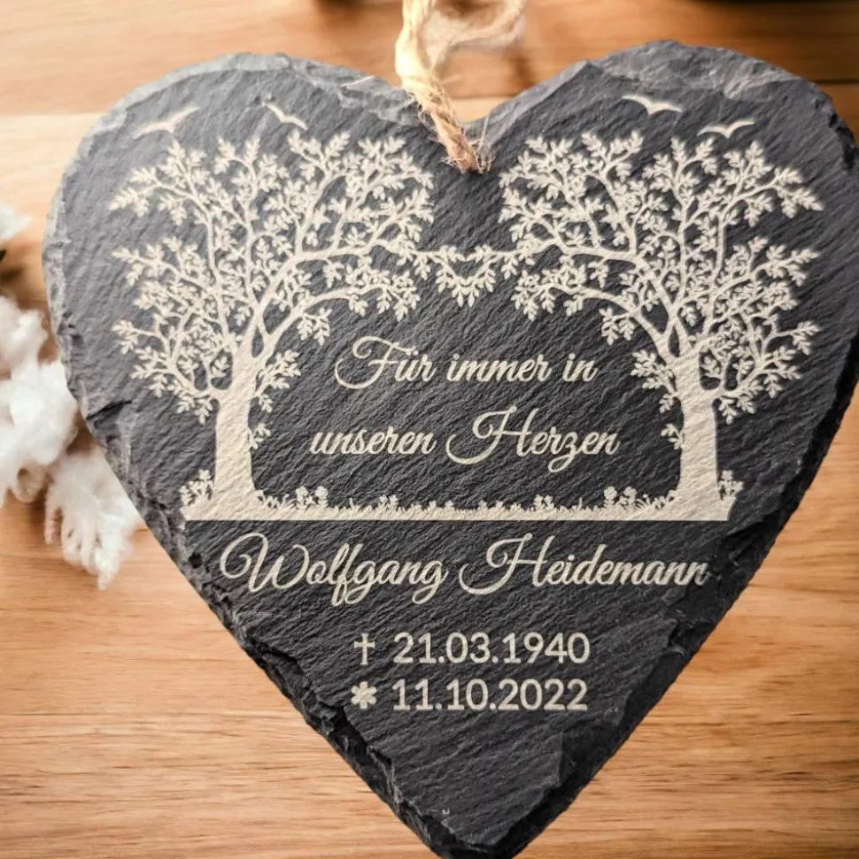 Die Schiefertafeln sind spalt Rauh, die Kanten sind behauen. Die Beschriftung wird mit dem Hochleistungslaser dauerhaft eingebrannt.