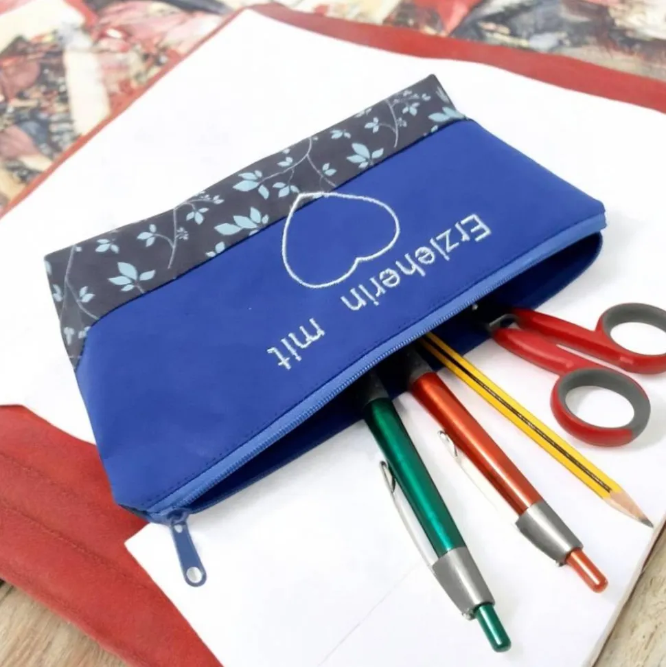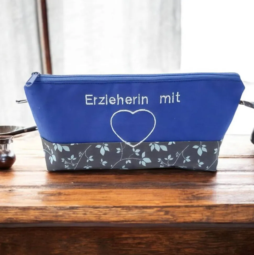 Süßes Statement Mäppchen aus Baumwolle genäht, bestickt mit den Worten: „Erzieherin mit ♥“. Ein tolles Abschiedsgeschenk für Erzieherinnen, das in Erinnerung bleibt, oder als kleines Dankeschön, sowie auch passend zum Geburtstag. Das Mäppchen ist verstärkt und hat mit seinen 4cm Bodentiefe einen guten Stand.
