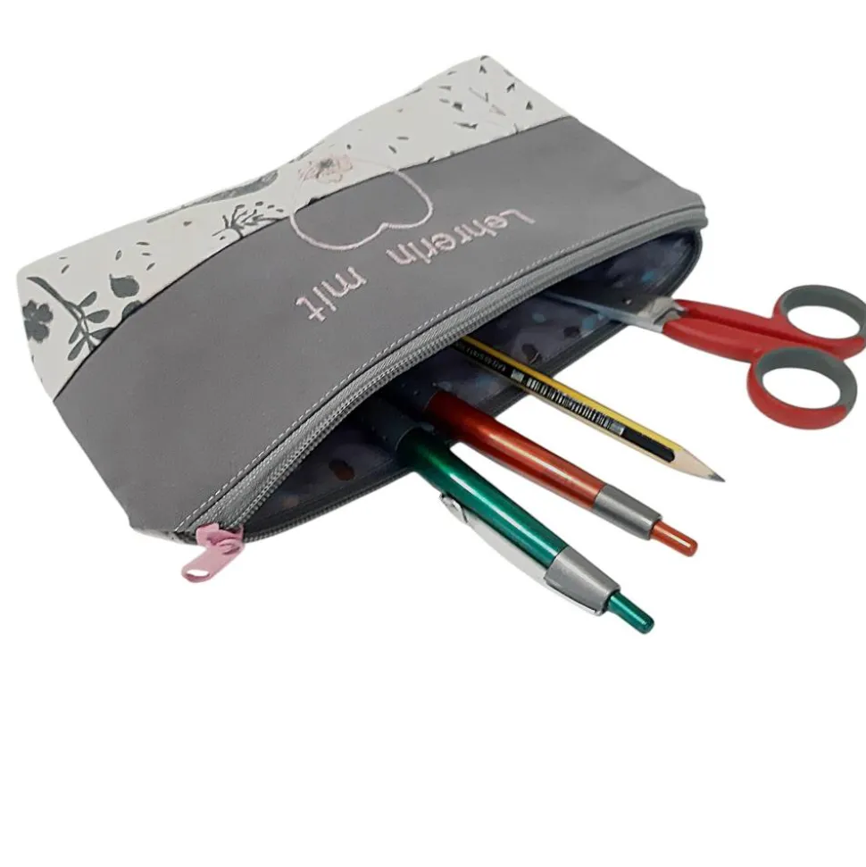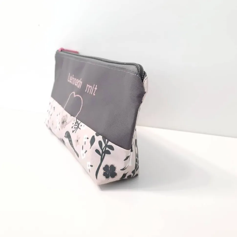 Süßes Statement Mäppchen aus Baumwolle genäht, bestickt mit den Worten: „Lehrerin mit Herz“. Ein tolles Abschiedsgeschenk für Lehrerinnen, das in Erinnerung bleibt, oder als kleines Dankeschön, sowie auch passend zum Geburtstag. Das Mäppchen ist verstärkt und hat mit seinen 4cm Bodentiefe einen guten Stand.