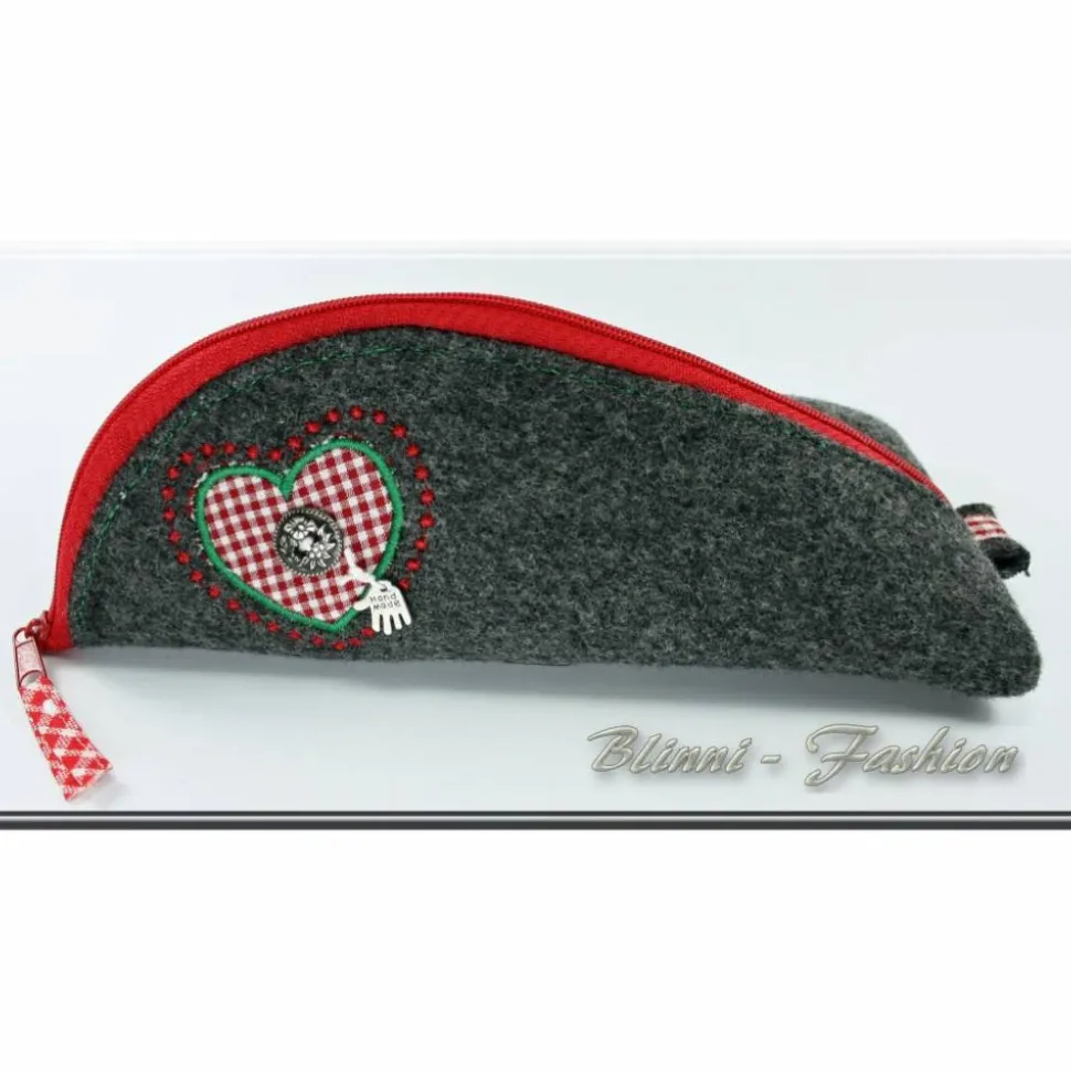 Dieses Mäppchen wurde aus einem hochwertigen Wollstoff genäht. Innen ist es mit rot-weiß gestreiftem Baumwollstoff gefüttert. Ein süßes Herz aus rotkariertem Stoff wurde appliziert, bestickt und mit Knopf und kleinem Anhänger aufgehübscht.
