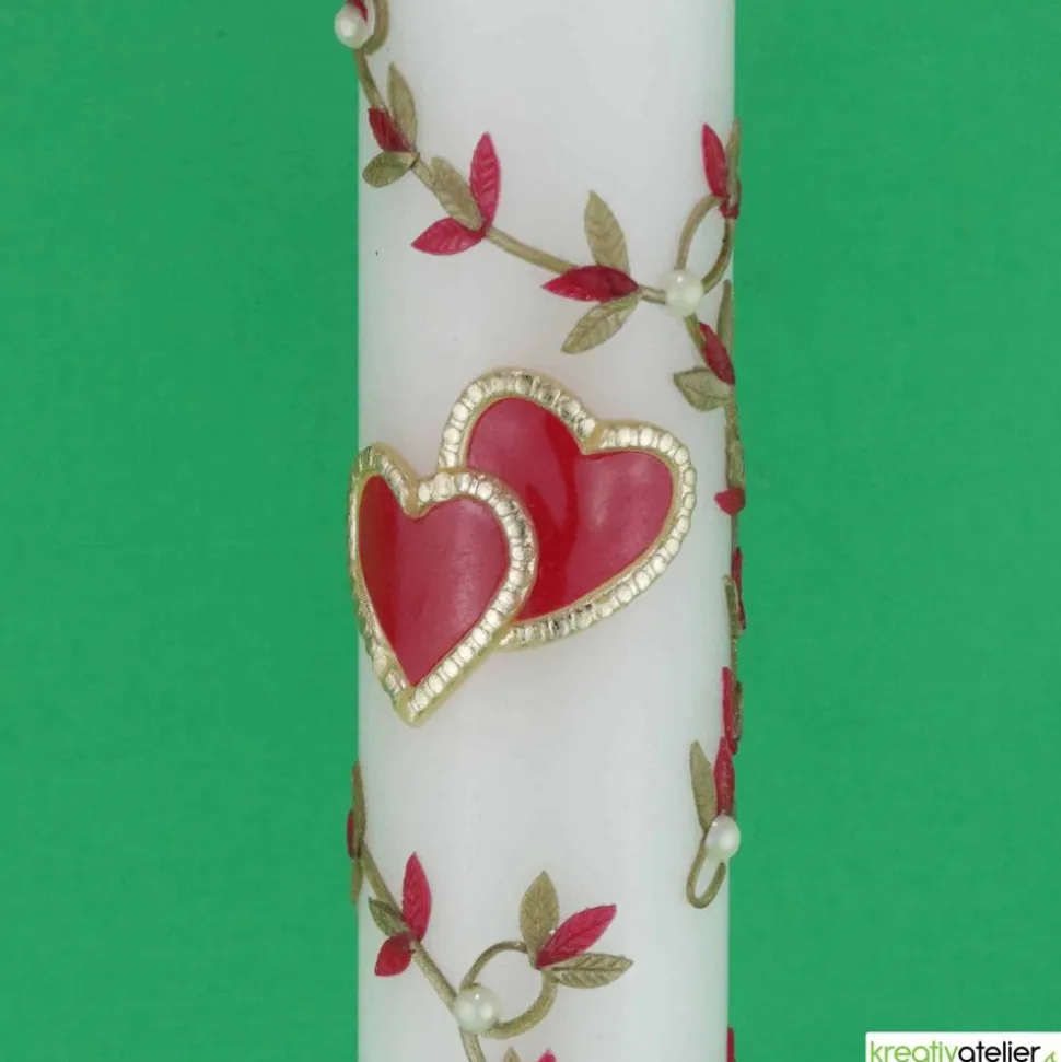 Diese handgefertigte Kerze ist mit einer zarten Blumenranke in Rubinrot und Gold verziert. Die beiden Herzen in der Mitte der Kerze sind ineinander verschlungen und werden von einem goldenen Rand umschlossen. Jedes dieser Ornamente auf der Kerze wird von mir in mühevoller Handarbeit einzeln ausgeschnitten, bevor ich es kunstvoll auf der Kerze arrangiere.