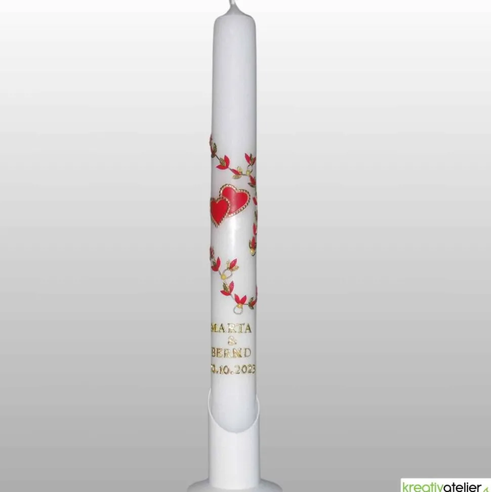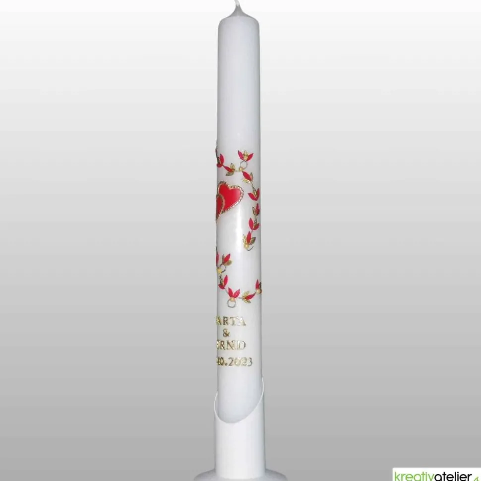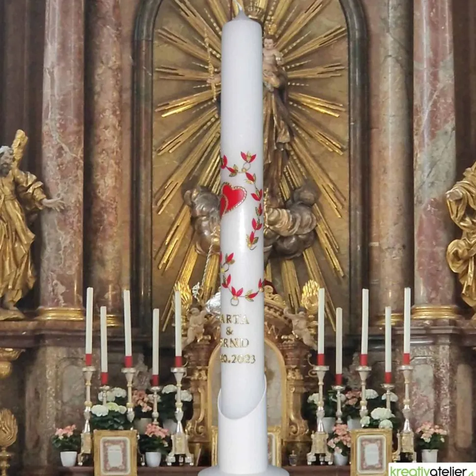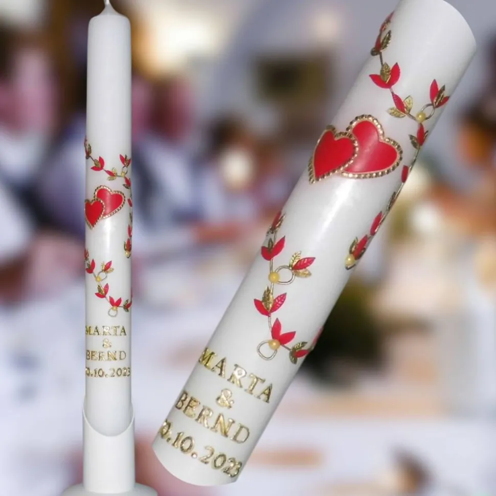 Diese schlanke weiße Hochzeitskerze mit Blumenranke und goldumrahmten rubinfarbigen Herzen ist nicht nur ein wunderschönes Accessoire für Ihre Hochzeitsfeier, sondern auch ein Symbol der Liebe und Verbundenheit des Brautpaares. Die personalisierte Kerze ist eine perfekte Wahl für Brautpaare, die ihre Hochzeitskerze individuell gestalten möchten, um das Andenken an diesen besonderen Tag in ihrem Leben zu bewahren.