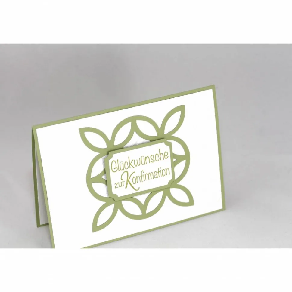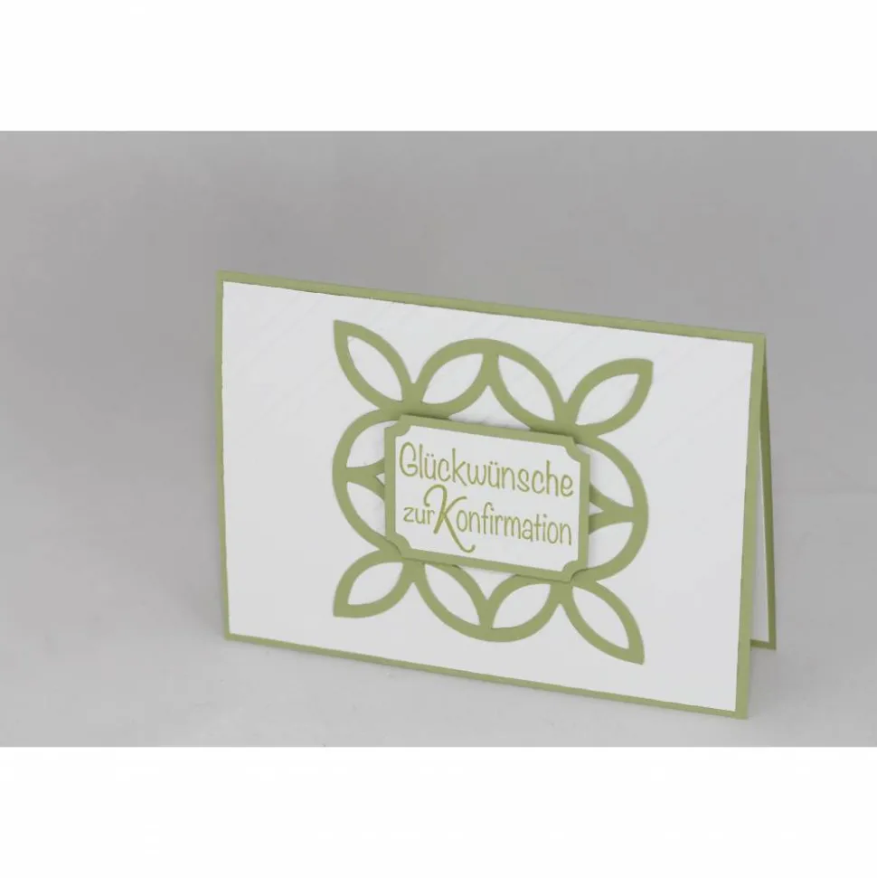 Die Grundkarte ist grün, darauf befindet sich ein weißer Aufleger, der mit einem Querstreifenmuster geprägt wurde. Mittig befindet sich ein hübsches, großes Stanzteil in grün. Die Glückwünsche wurden gestempelt, ausgestanzt und mit Grün unterlegt. Für mehr Tiefe habe ich dieses Schildchen mit Abstandklebepads aufgeklebt. Die Farbe wurde bewußt neutral gehalten, so passt die Karte sowohl für Jungen wie auch Mädchen.