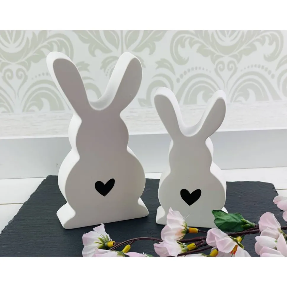 Aufgrund der Zusammensetzung des Giespulvers sollten die Hasen nur in Innenräumen als Deko verwendet werden und nicht draußen oder in Feuchträumen