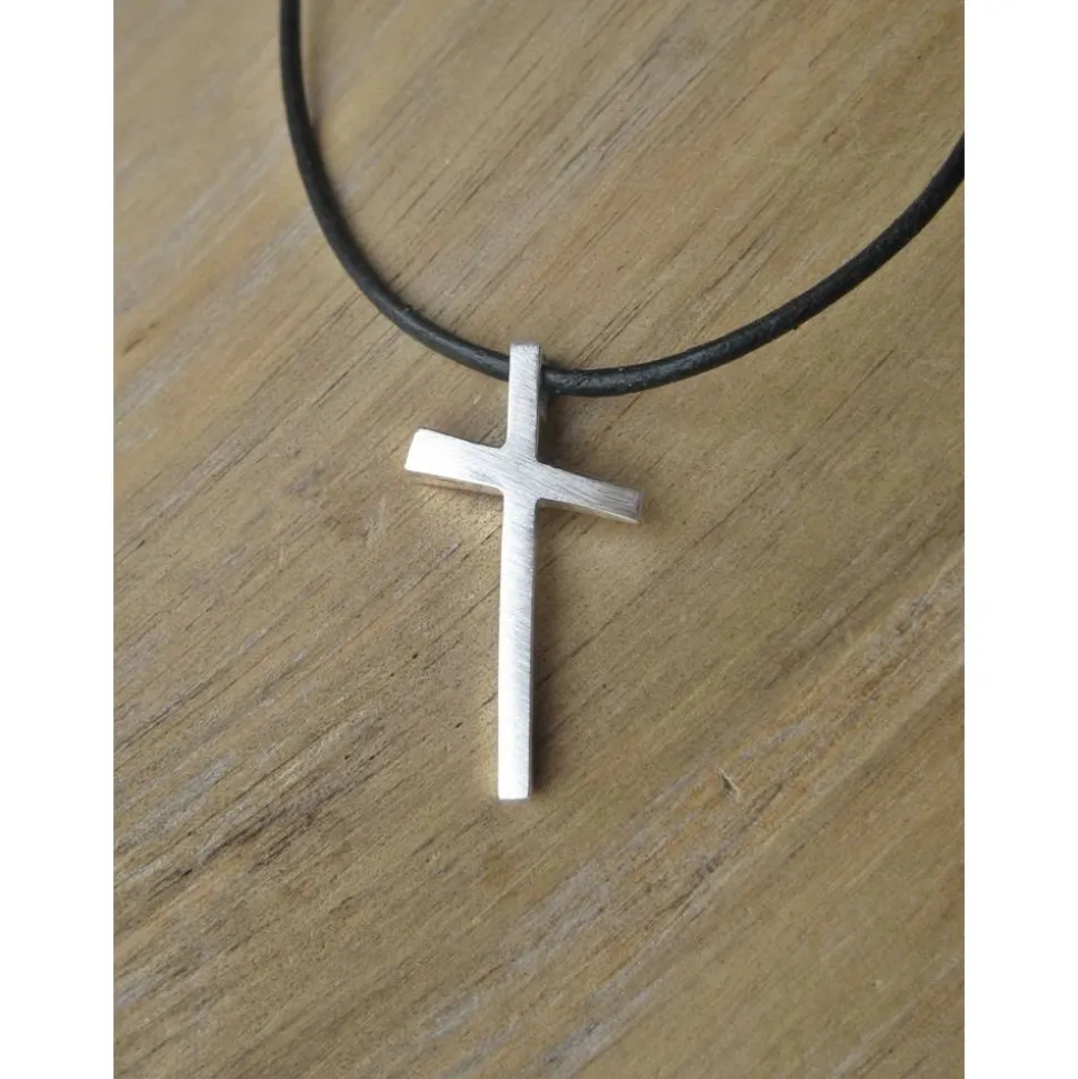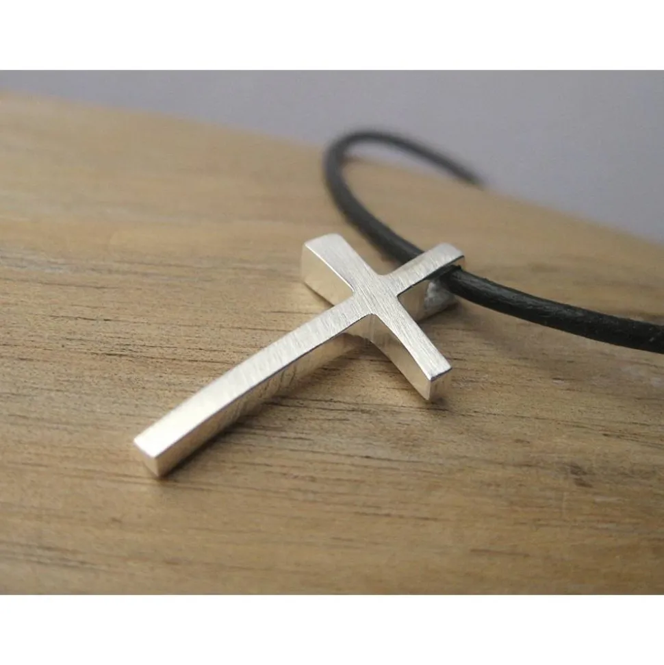 Modernes, einfaches Kreuz, der Querbalken dieses Silberkreuzes ist schräg zum Längsbalken angebracht. Die dadurch entstandene asymmetrische Form lässt das Schmuckstück interessant und ungewöhnlich erscheinen. Dieser Anhänger ist ein ideales Geschenk, nicht nur zur Konfirmation, Kommunion, Firmung, sondern auch einfach als Zeichen zum Glaubensbekenntnis. Das Kreuz hat eine strichmatte Oberfläche, es wird an einem Lederband (Schiebeknoten, Länge variabel einstellbar) oder mit Silberkette, in einer Geschenketui verschickt.