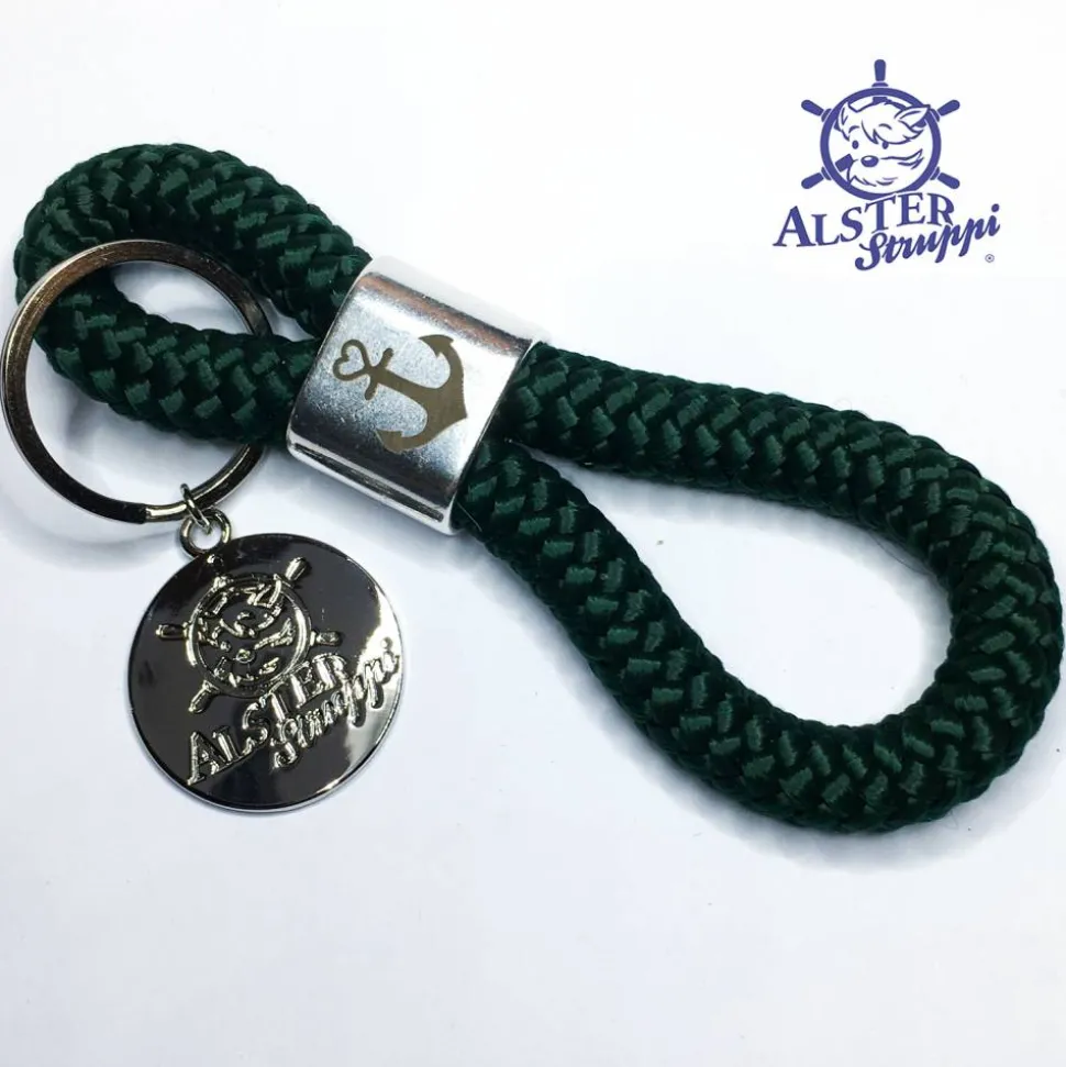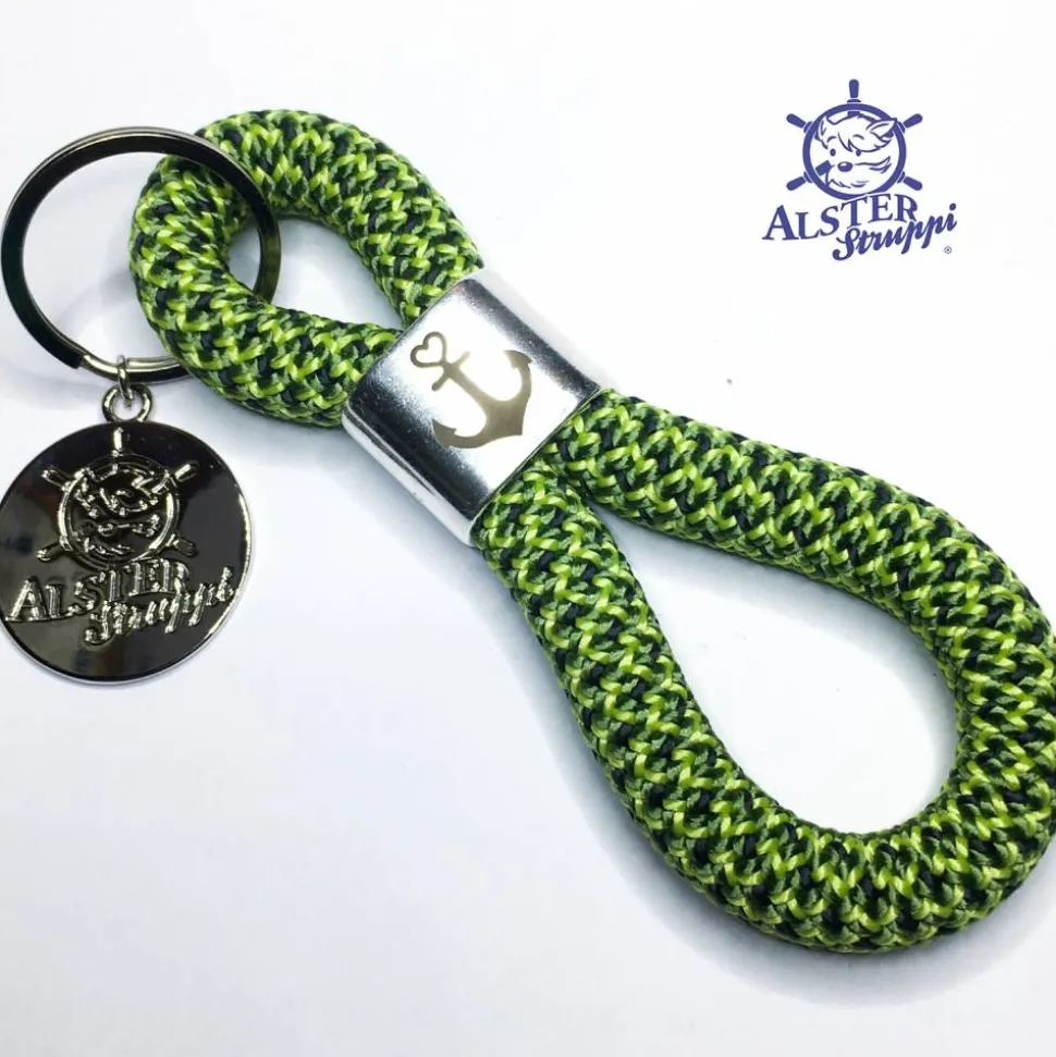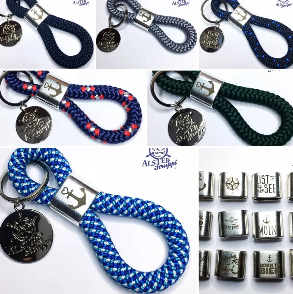 Ein schöner handgefertigter Schlüsselanhänger aus PPM Tau, Kletterseil oder Segeltau, der Marke AlsterStruppi aus Tau 10 mm, Länge ca. 12 cm, Slider versilbert, Motiv nach Wunsch, Schlüsselring in silberfarben.