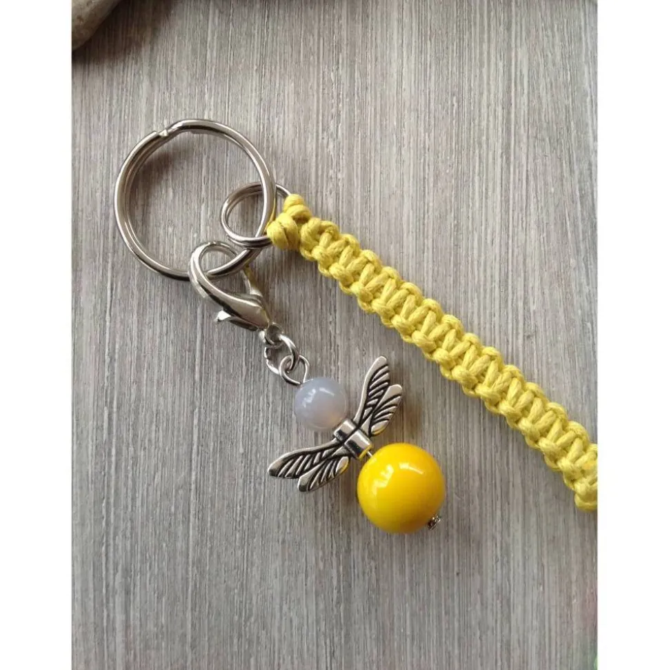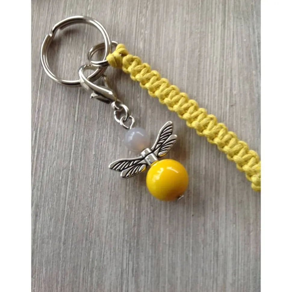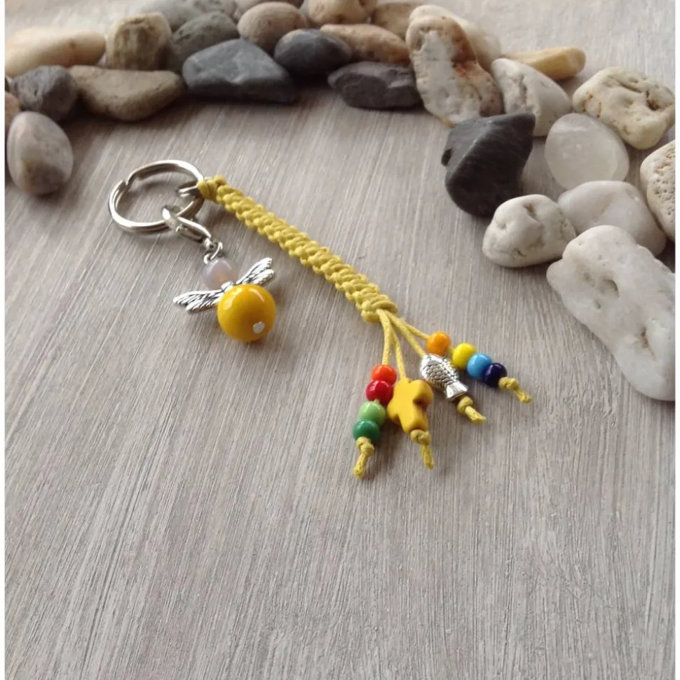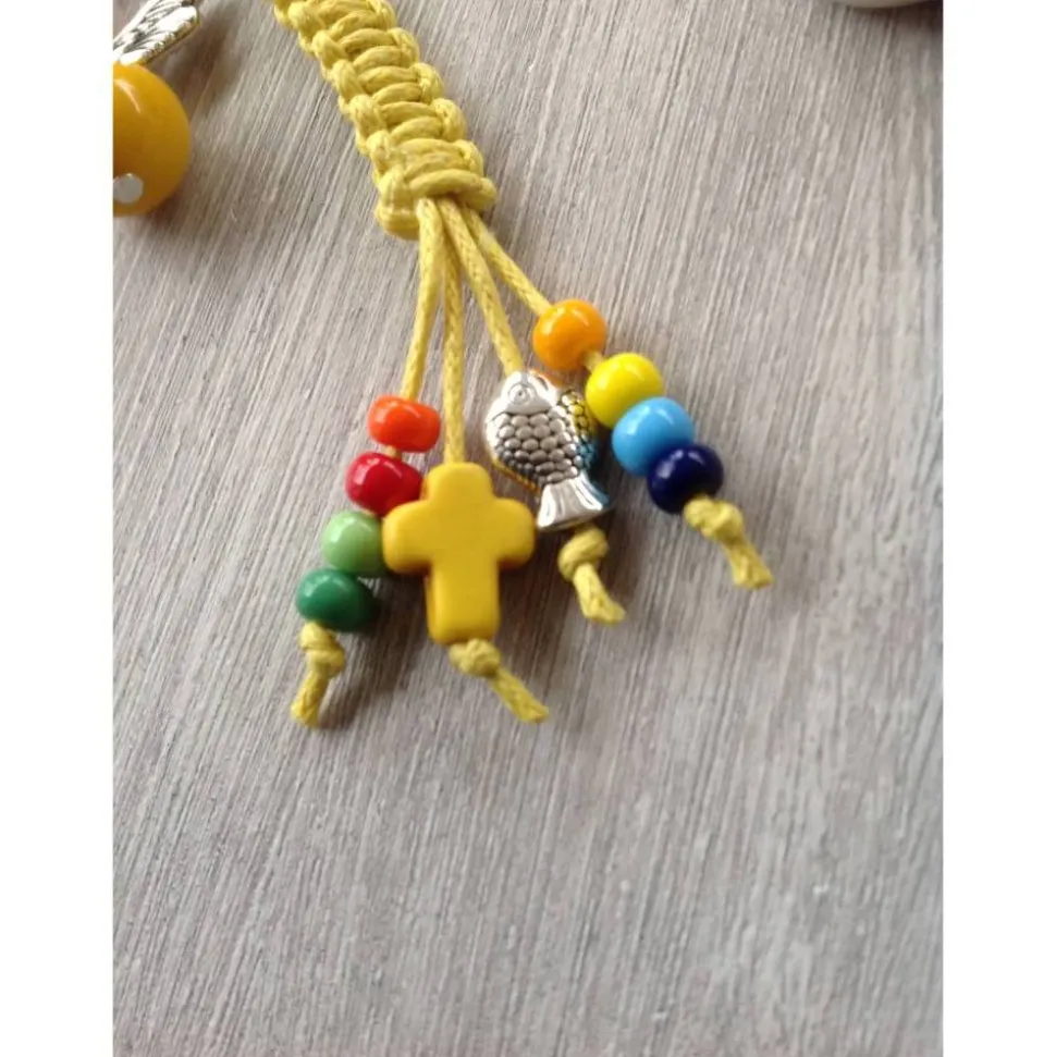 Der Anhänger wurde aus gelben, gewachstem Baumwollband geknüpft und mit einem Howlithkreuz ( Höhe 10mm ), einem Metallfisch (Höhe 0,9 cm ) und bunten Rovcailles verziert. Das Engelchen aus Metallflügeln und Glasperlen ist an einem 16 mm hohem Karabiner befestigt. Der Schlüsselring hat einen Durchmesser von 1,7 cm. Gesamtlänge: 10 cm.