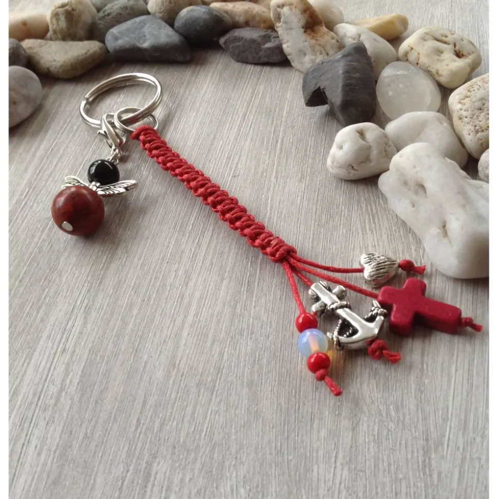 Der Anhänger wurde aus rotem, gewachstem Baumwollband geknüpft und mit einem Howlithkreuz ( Höhe 16mm ), einem Metallanker (Höhe 1,8 cm ), einem Metallherzchen, einer Mondsteinperle, (Duchmesser 6mm ) und roten Rocailles verziert. Das Engelchen aus einer roten Jaspisperle, Metallflügeln und einer schwarzen Glaswachsperle ist an einem 16 mm hohem Karabiner befestigt. Der Schlüsselring hat einen Durchmesser von 2,2 cm. Gesamtlänge: 10,5 cm.