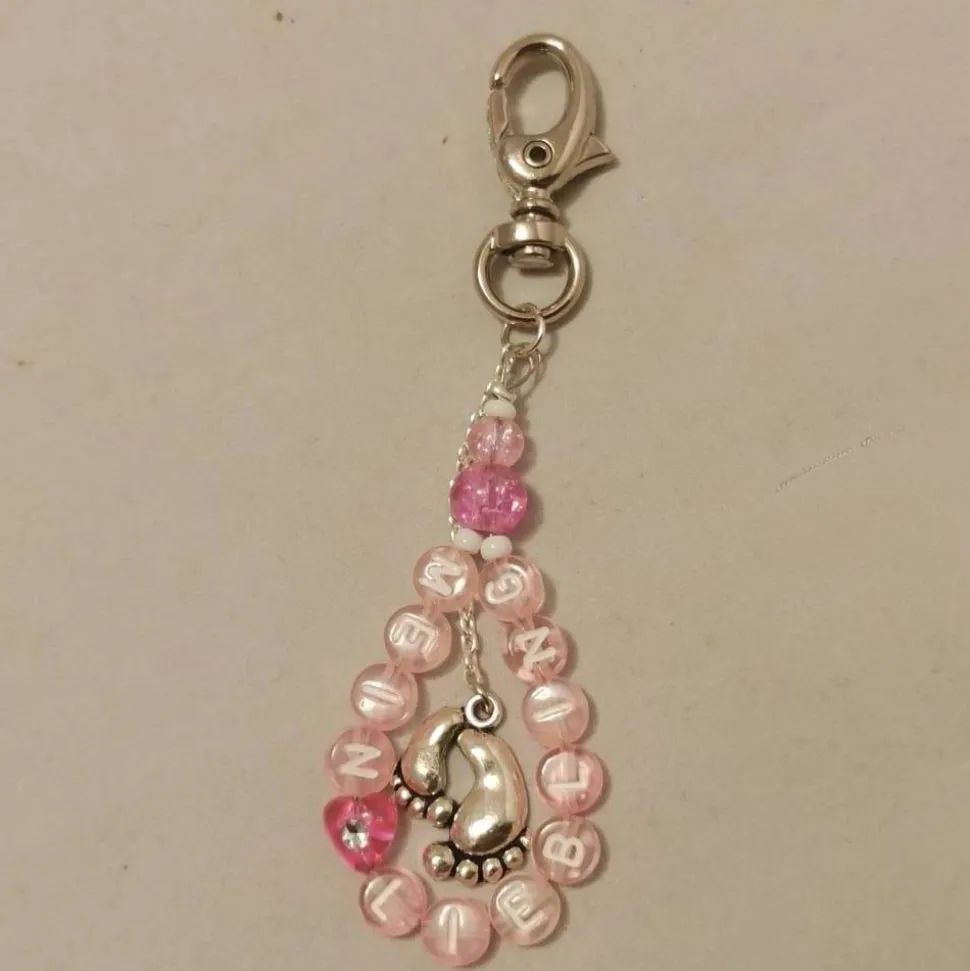 Dieser Schlüsselanhänger ist aus Acryl-Buchstabenperlen (rosa mit weißer Schrift) gefertigt und trägt den herzlichen „MEIN LIEBLING“-Text. Besonderer Blickfang ist der versilberte Anhänger in Form von Kinderfüßen, der mit rosa-farbenen Crackel-Perlen, weißen Rocailles und einem eingearbeiteten rosa Herzchen mit Strass verziert ist.