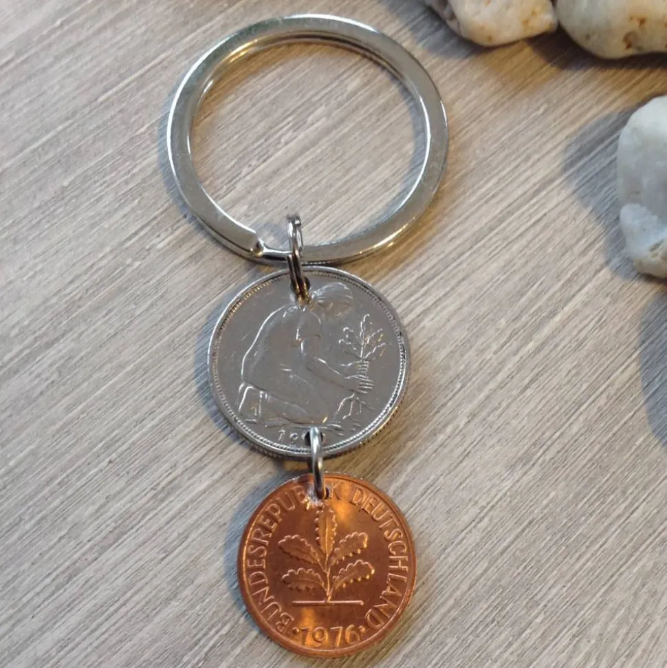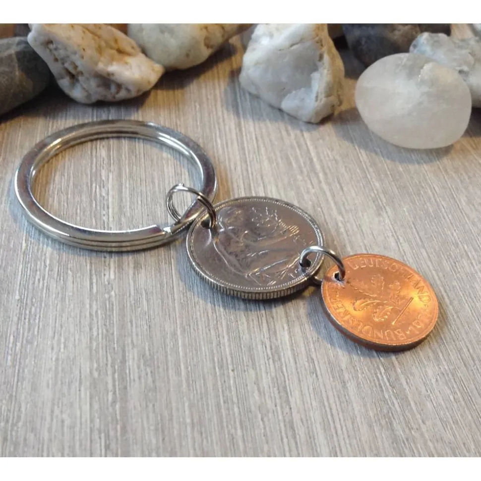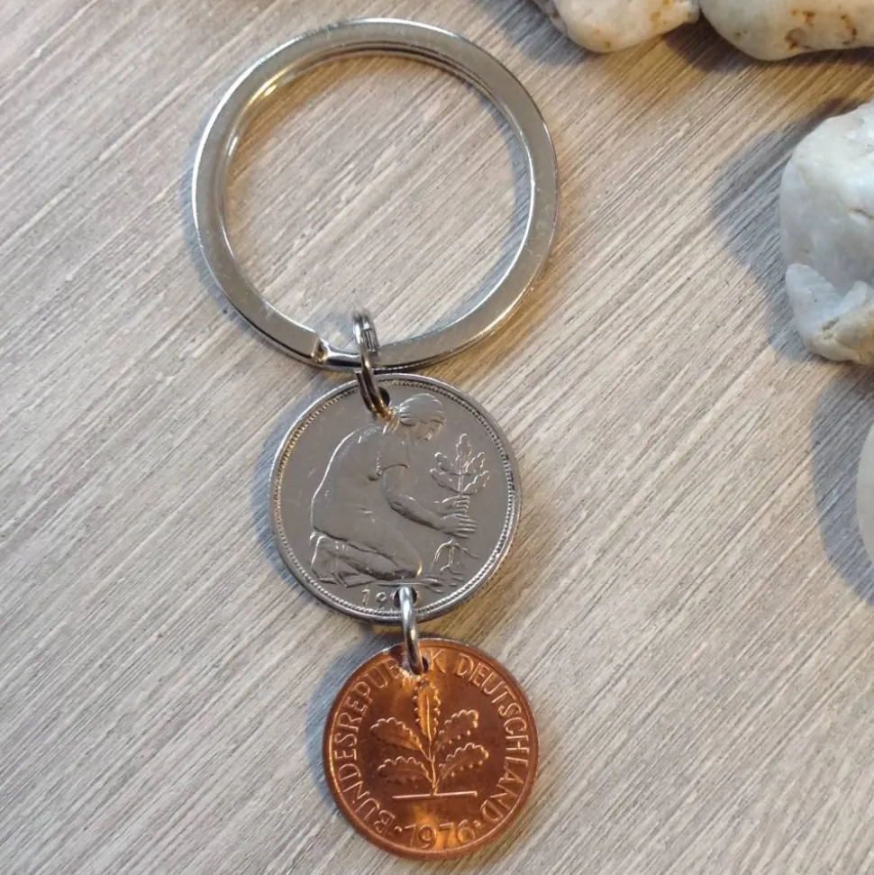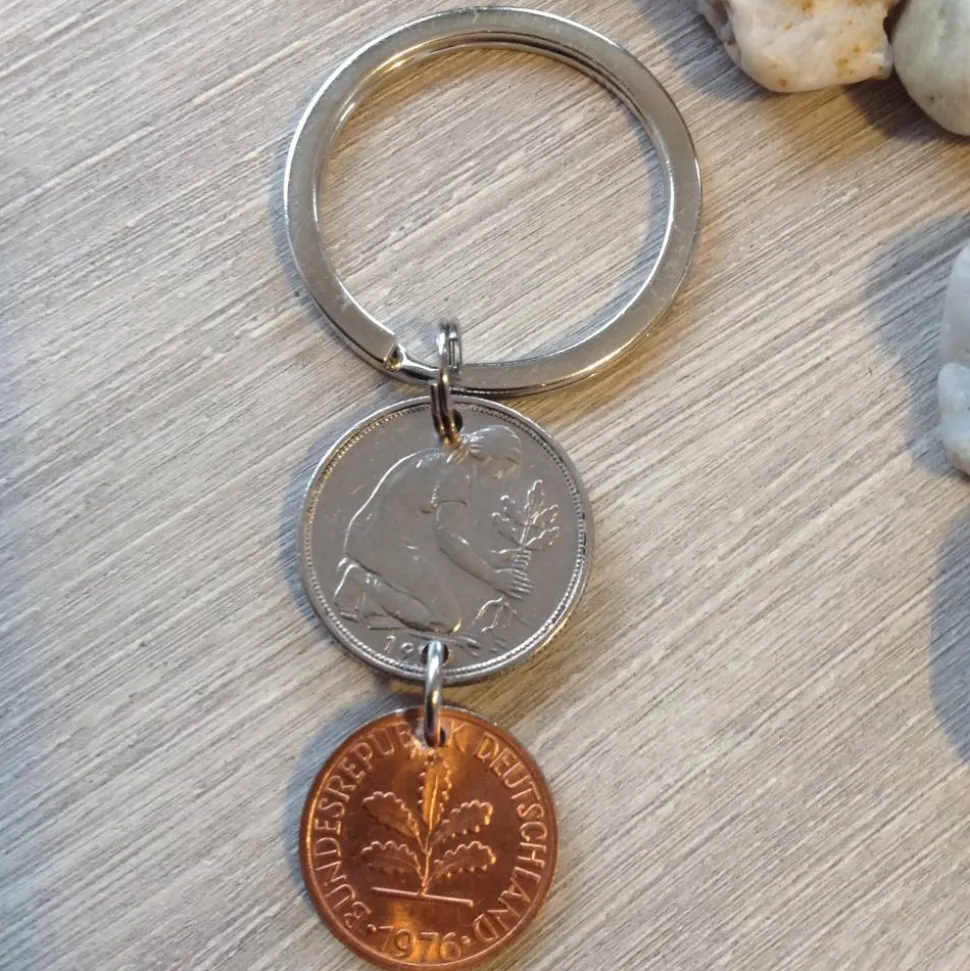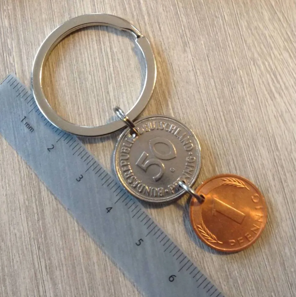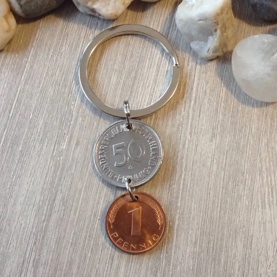 Schlüsselanhänger aus einem alten 50 Pfennig Stück und einem fast bankfrischem Pfennig von 1976.