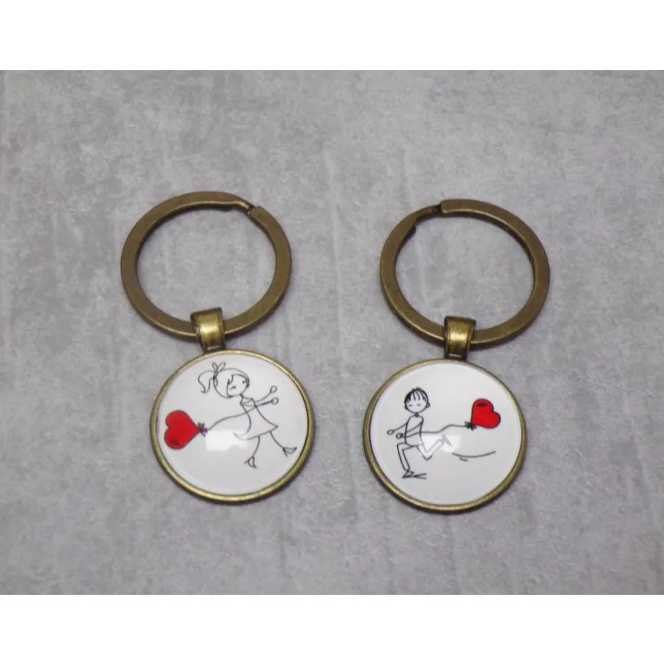 Die Schlüsselanhänger sind aus robustem Stahl gefertigt und überzeugen durch ihr einzigartiges Motiv: Junge und Mädchen mit Herz. Jeder Cabochon hat einen Durchmesser von ca. 2,8 cm und besteht aus Glascabochon mit einseitigem Motiv. Die Rückseite ist mit einer bronzenen Metallfassung versehen.