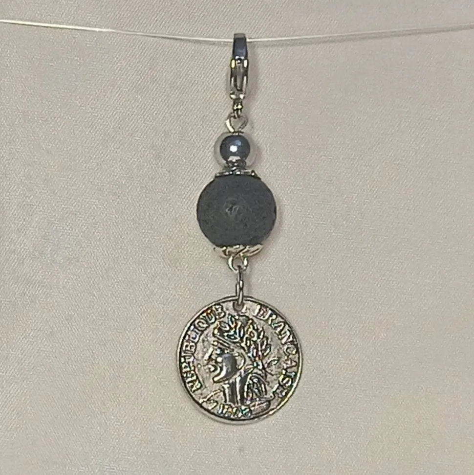 Schlüsselanhänger/Taschenbaumler zum Beduften – entdecke die kreative Verbindung aus Funktionalität und Wohlbefinden! Dieser einzigartige Duftschmuck ist mit einer schwarzen Lavaperle (14mmØ) und einem Glücksmünzen-Anhänger (23mmØ) ausgestattet und bietet dir die Möglichkeit, deinen Lieblingsduft immer bei dir zu tragen.