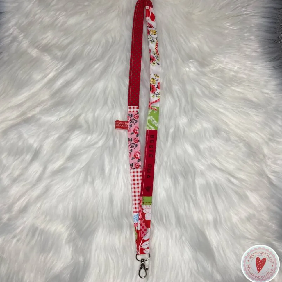 Schlüsselband, genäht aus verschiedenen Baumwollstoffen, bestempelt mit „Beste Oma“