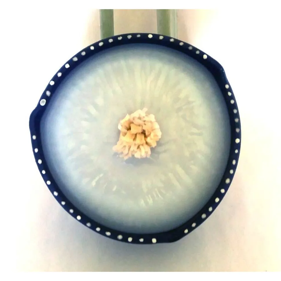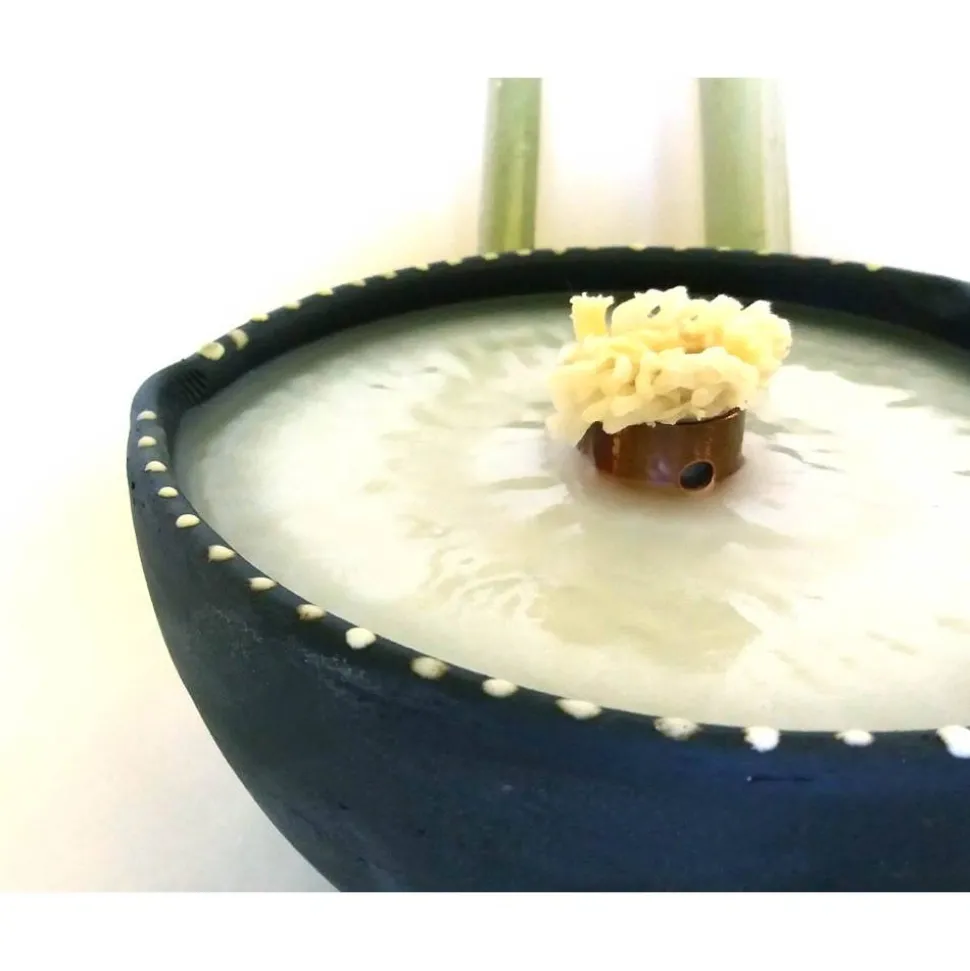 Ein Dauerdocht aus Glasfaser in einem hochwärmeleitenden Metallbrenner leitet flüssiges Wachs nach oben, wo es verbrennt.