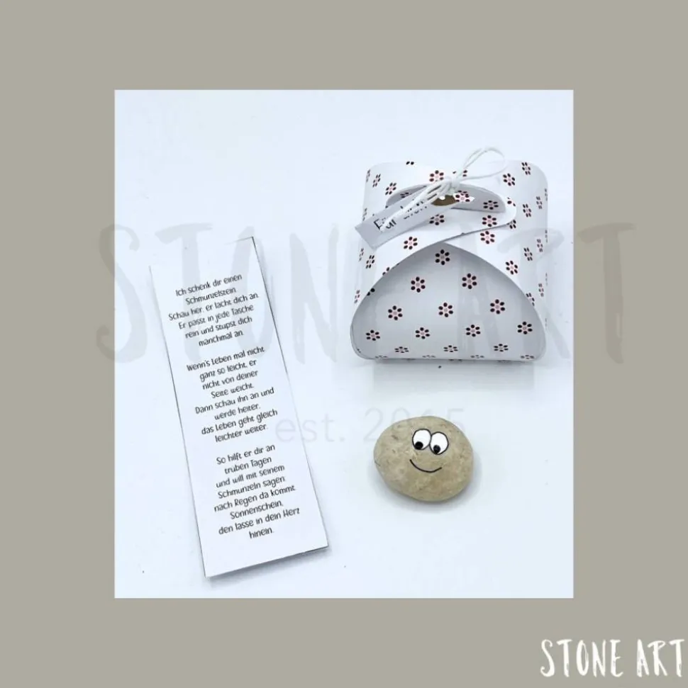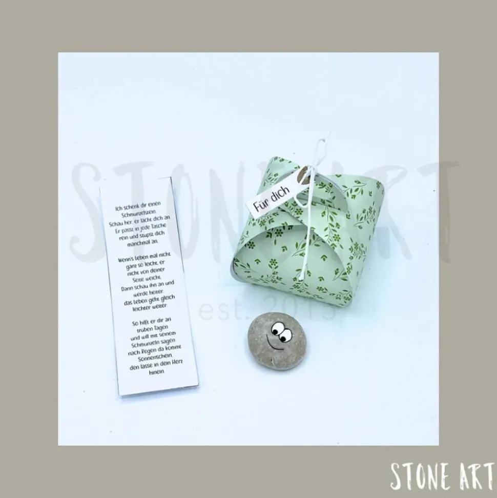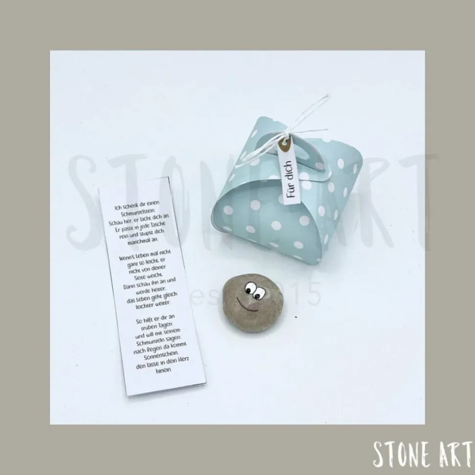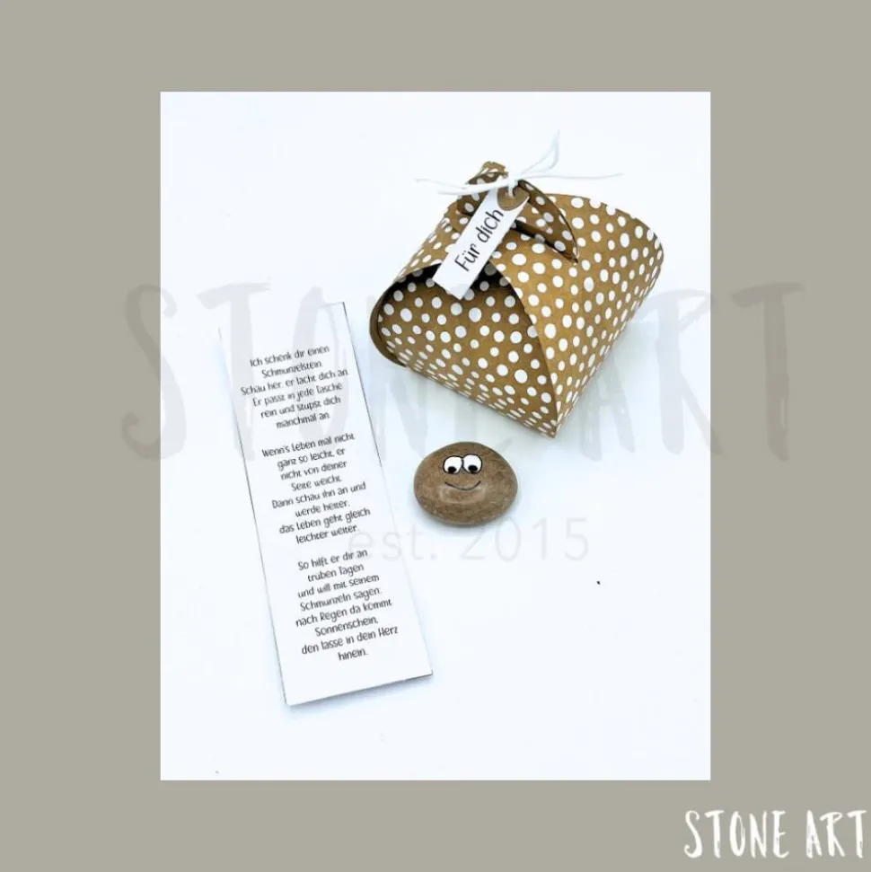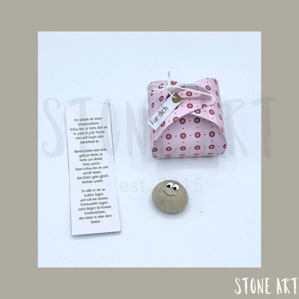 Jeder Schmunzelstein kommt zusammen mit einem kleinen Gedicht in einer hochwertigen Papierschachtel zu dir. Die kleinen Kerlchen sind zwischen 2 und 3 cm groß und sorgen garantiert für ein Lächeln. Die Schachteln bestehen aus hochwertigem Designpapier und sind Beispiele – du kannst den Farbton wählen, aber keine speziellen Muster oder Papiere auswählen.