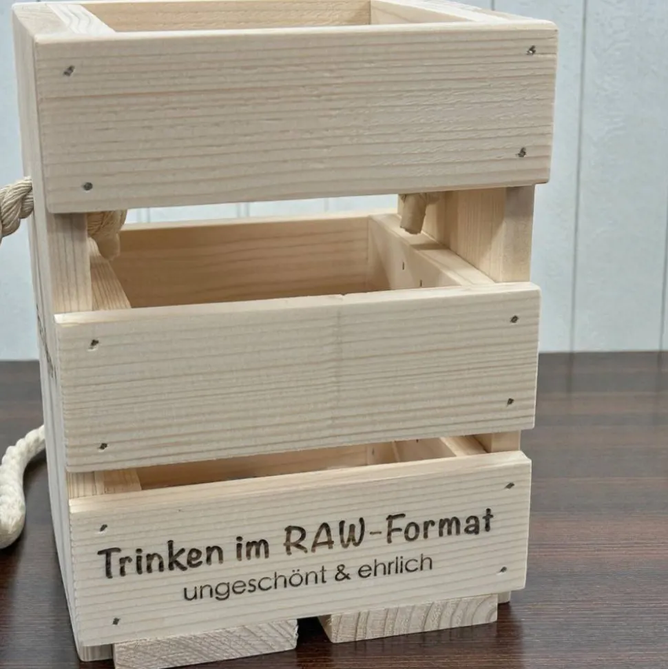 Diese noch nirgendwo gesehene handgefertigte „Schnapstasche“ ist aus Konstruktionsvollholz KVH hergestellt und für eine 1,0l Schnapsflasche mit einem Durchmesser von 8,2cm gedacht.