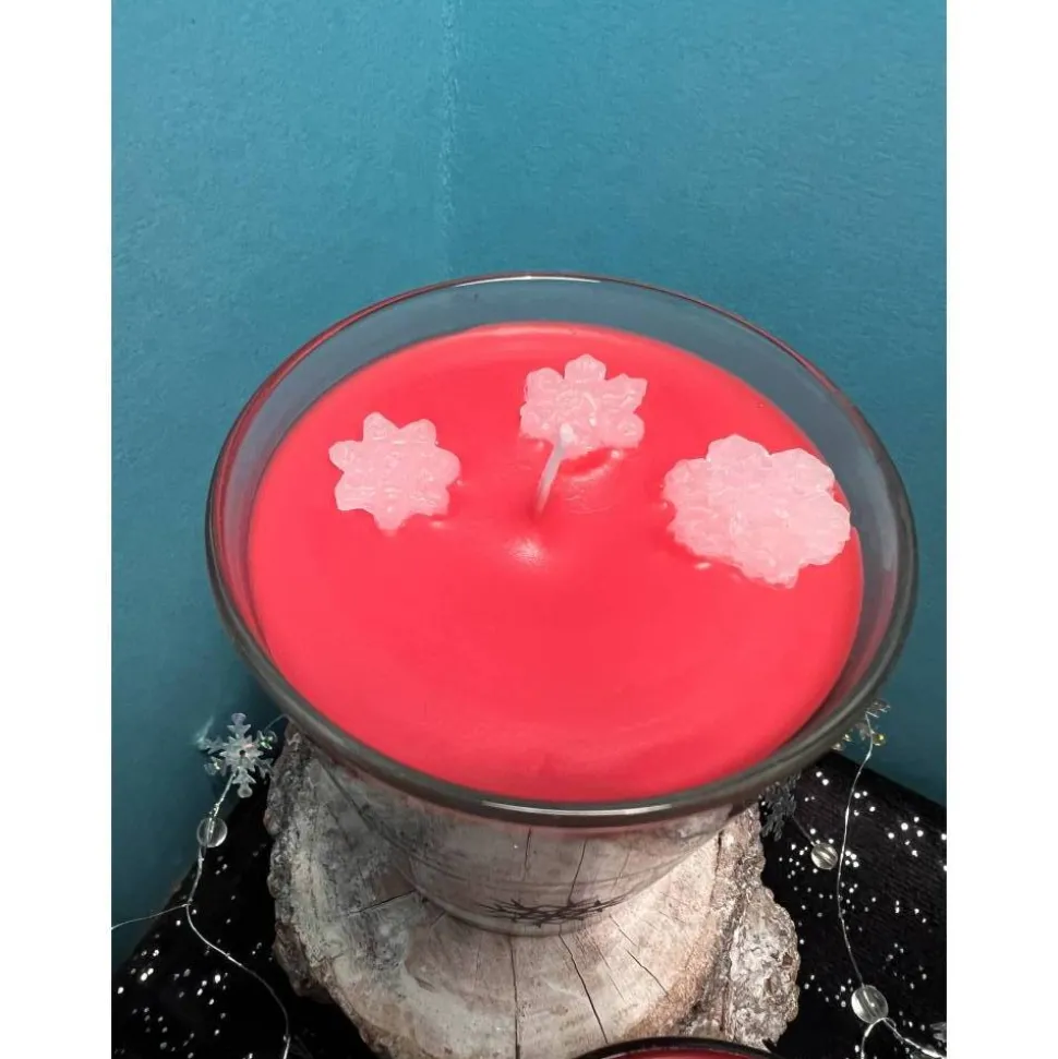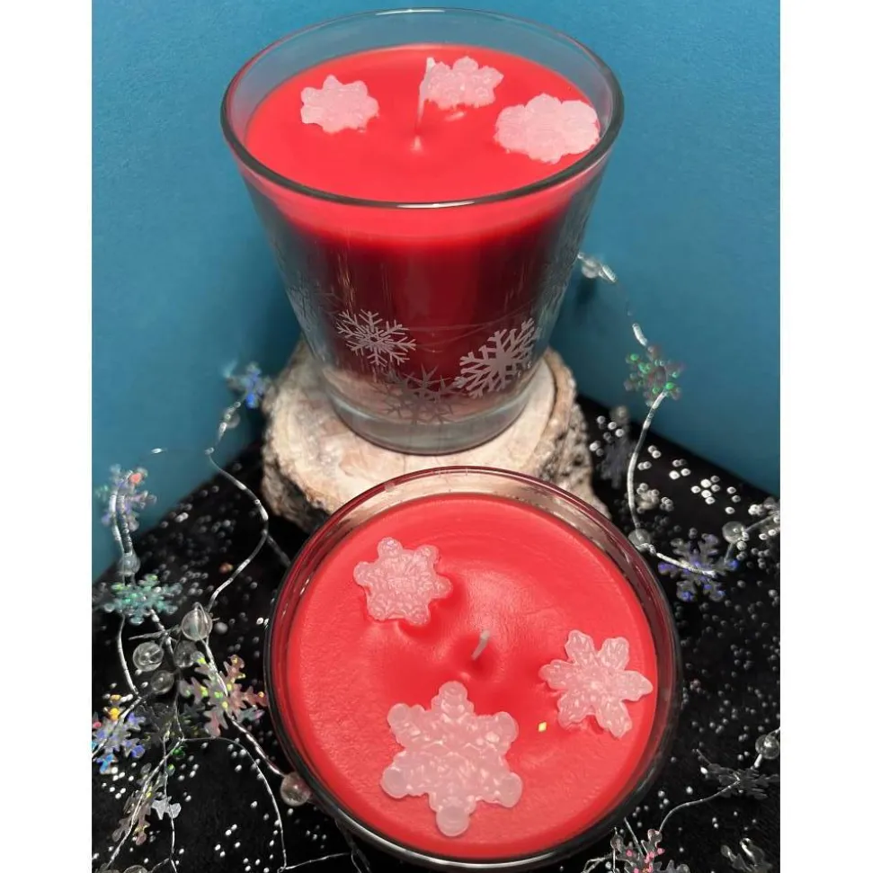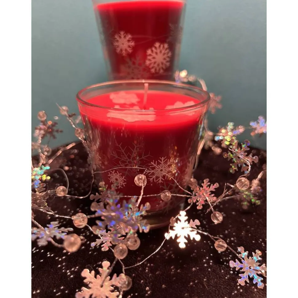 Farbe: Leuchtend Rot mit dekorativen weißen Schneeflocken aus Wachs.