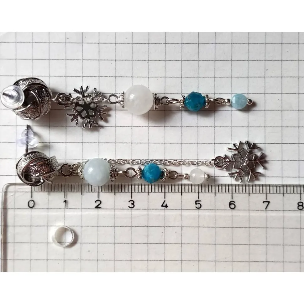 Leider gelingt es mir nicht wirklich, die tatsächliche Schönheit der Edelsteine und der Schneeflocken-Anhänger auf den Fotos wieder zu geben. Lineal und andere Edelsteine sowie etwaige Dekorationsgegenstände dienen nur dem Größen- und Farbvergleich und sind nicht Bestandteil des Angebots. Auf Foto 8 ist einer der Ohrringe von der Vorder- und der zweite von der Rückseite zu sehen, 4 weitere Ohrring-Paare dieser Serie sind im direkten Vergleich auf Foto 9 und auf Foto 10 eine Auswahl gold-farbener Ohrring-Paare dieser Serie (jeweils in separaten Angeboten).
